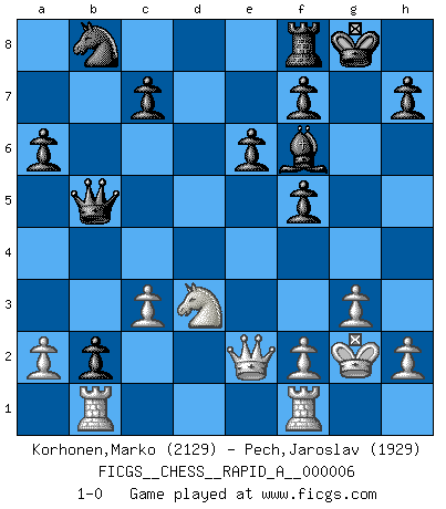 Last move : 1-0 2007 February 20 17:13:15 [Event "FICGS__CHESS__RAPID_A__000006"] [Site "FICGS"] [Date "2006.12.03"] [Round "1"] [White "Korhonen,Marko"] [Black "Pech,Jaroslav"] [Result "1-0"] [WhiteElo "2129"] [BlackElo "1929"] 1.e4 e6 2.d4 d5 3.Nc3 Nf6 4.Bg5 dxe4 5.Nxe4 Be7 6.Bxf6 gxf6 7.Nf3 a6 8.g3 f5 9.Nc3 b5 10.Bg2 Bb7 11.O-O O-O 12.Ne5 Bxg2 13.Kxg2 b4 14.Qf3 bxc3 15.Qxa8 Qxd4 16.Nd3 Qb6 17.Qf3 cxb2 18.Rab1 Bf6 19.Qe2 Qb5 20.c3 1-0 This chess game has been lost on time (started : 2006.12.03 10:30:27) French : Burn variation Kingside Castling by player White (move 11) Kingside Castling by player Black (move 11) Player White won this chess game. Follow this game move after move (download)Fischer Chess play was always razor-sharp, rational and brilliant. One of the best ever. (Dave Regis) Ich las kürzlich ein Buch von Nietzsche. Er sagte Religion verdumme nur die Menschen. Ich stimme zu. (Robert James Fischer) Cuando tu no sabes absolutamente que mas hacer, es tiempo de entrar en pánico. (John van der Wiel) Tous ces prétendus hommes politiques sont les pions, les Cavaliers, les Tours ou les Fous d'une partie d'échecs qui se jouera tant qu'un hasard ne renversera pas l'échiquier. (Honoré de Balzac) The ego is not master in its own house. (Sigmund Freud)
