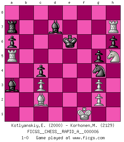 Last move : 1-0 2007 February 27 6:24:8 [Event "FICGS__CHESS__RAPID_A__000006"] [Site "FICGS"] [Date "2006.12.03"] [Round "1"] [White "Kotlyanskiy,Edward"] [Black "Korhonen,Marko"] [Result "1-0"] [WhiteElo "2000"] [BlackElo "2129"] 1.e4 c5 2.Nf3 d6 3.d4 cxd4 4.Nxd4 Nf6 5.Nc3 a6 6.Be3 Ng4 7.Bc1 Nf6 8.Be3 Ng4 9.Bg5 h6 10.Bc1 Nf6 11.Bc4 e6 12.O-O Nc6 13.Nxc6 bxc6 14.Qf3 d5 15.Bb3 Qc7 16.Re1 Be7 17.Bf4 Qb7 18.Rad1 O-O 19.Rd3 Kh8 20.a3 Qa7 21.e5 Nh7 22.Qg4 f6 23.Qg3 c5 24.Ba4 c4 25.Rd2 Qb7 26.exf6 Bxf6 27.Bd6 Qxb2 28.Nd1 Qb6 29.Bxf8 Nxf8 30.c3 Ra7 31.Rb2 Qc7 32.Bc2 Qxg3 33.hxg3 Kg8 34.Kf1 Kf7 35.f4 Nd7 36.f5 Nc5 37.Rb6 Be7 38.Ne3 Nd3 39.Rd1 Ne5 40.Rb8 Bd7 41.fxe6+ Bxe6 42.Nxd5 Bxa3 43.Nf4 Bd7 44.Rd5 g5 45.Rh8 Ng4 46.Rh7+ Kf6 47.Nh5+ Ke6 48.Ra5 1-0 Sicilian : Najdorf, Byrne (English) attack Kingside Castling by player White (move 12) Kingside Castling by player Black (move 18) Player White won this chess game. Follow this game move after move (download)Chess is a forcing house where the fruits of character can ripen more fully than in life. (Edward Morgan Foster) Besser ein falscher Plan, logisch durchgeführt, als gar kein Plan. (Viktor Kortschnoi) Botvinnik trató de alejar el misterio referente al Ajedrez, siempre relacionandolo a situaciones de la vida diaria. Solía llamar al Ajedrez un problema inexacto típico, similar a aquellos en que la gente tiene siempre que resolver a cada día. (Garry Kasparov) Une platitude souvent récitée à propos des Echecs est qu'une des choses les plus difficiles à réaliser est de gagner une position gagnante. Cela ne manque pas de sens mais, pour ma part, j'ai toujours trouvé plus difficile de gagner une position perdante. (Tim Krabbe) Everything in life is luck. (Donald Trump)