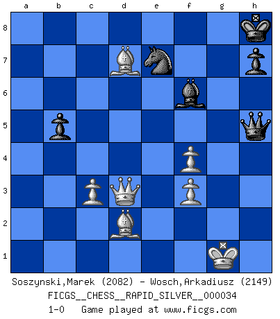 Last move : 1-0 2011 March 17 23:55:50 [Event "FICGS__CHESS__RAPID_SILVER__000034"] [Site "FICGS"] [Date "2010.12.11"] [Round "2"] [White "Soszynski,Marek"] [Black "Wosch,Arkadiusz"] [Result "1-0"] [WhiteElo "2082"] [BlackElo "2149"] 1.e4 c5 2.Nf3 Nc6 3.Bb5 g6 4.O-O Bg7 5.c3 Nf6 6.Re1 O-O 7.e5 Nd5 8.d4 cxd4 9.cxd4 d6 10.Nc3 Nxc3 11.bxc3 Bg4 12.exd6 Qxd6 13.h3 Bxf3 14.Qxf3 e5 15.a4 Rfd8 16.dxe5 Bxe5 17.Bg5 f6 18.Rad1 Qe6 19.Bh6 Kh8 20.h4 Rac8 21.g3 Rxd1 22.Rxd1 a6 23.Bf1 Re8 24.Bg2 Rd8 25.h5 Rd7 26.Qe2 Rxd1+ 27.Qxd1 gxh5 28.Qxh5 f5 29.Bd2 Qd7 30.Qe2 Qd6 31.Qe3 Na5 32.Bc1 Qd1+ 33.Kh2 Qh5+ 34.Bh3 Nc6 35.Qd3 Kg7 36.Kg2 f4 37.gxf4 Bf6 38.Bc8 Qf7 39.Bd2 Kh8 40.Kh2 Qh5+ 41.Kg1 b5 42.axb5 axb5 43.Bd7 Ne7 44.f3 1-0 Sicilian : Nimzovich-Rossolimo attack (with ...g6, without ...d6) Kingside Castling by player White (move 4) Kingside Castling by player Black (move 6) Player White won this chess game. Follow this game move after move (download)It is not enough to be a good player... you must also play well. (Siegbert Tarrasch) Es ist wirklich schade, dass so viele Schachspieler nicht auf ihr Äußeres achten! (Alexandra Kosteniuk) El pensamiento metódico es mas útil en el Ajedrez que la inspiración. (C. J. S. Purdy) Aux échecs, les retours au sommet sont rares : les dommages psychologiques consécutifs à une défaite sont trop sévères. (Daily Telegraph) Every man's memory is his private literature. (Aldous Huxley)
