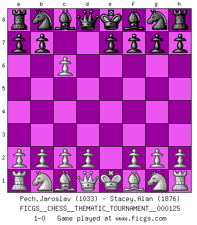Last move : 1-0 2011 February 5 10:2:39 [Event "FICGS__CHESS__THEMATIC_TOURNAMENT__000125"] [Site "FICGS"] [Date "2010.12.11"] [Round "1"] [White "Pech,Jaroslav"] [Black "Stacey,Alan"] [Result "1-0"] [WhiteElo "1033"] [BlackElo "1876"] 1.e4 d5 2.exd5 c6 3.dxc6 1-0 This chess game has been lost on time (started : 2010.12.11 23:12:10) Scandinavian (centre counter) defense Player White won this chess game. Follow this game move after move (download)Don't even mention losing to me. I can't stand to think of it. (Bobby Fischer) Ich glaube, ich kenne inzwischen die Gründe für mein Versagen: schachliche Charakterfehler. Ich war nie ein Wunderkind und in meiner gesamten menschlichen Entwicklung immer zu langsam. (Viktor Kortschnoi) El Ajedrez es una guerra en un tablero. El objetivo es aplastar la mente del oponente. (Bobby Fischer) Donnez-moi un Cavalier en 6e et je gagnerais toutes mes parties. (Steinitz) A specialist learns more and more about less and less until he knows everything about nothing. (Nicholas Murray Butler)