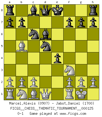 Last move : 0-1 2010 December 24 7:30:41 [Event "FICGS__CHESS__THEMATIC_TOURNAMENT__000125"] [Site "FICGS"] [Date "2010.12.11"] [Round "1"] [White "Marcel,Alexis"] [Black "Jabot,Daniel"] [Result "0-1"] [WhiteElo "0907"] [BlackElo "1700"] 1.e4 d5 2.exd5 c6 3.dxc6 Nxc6 4.Nf3 e5 5.Bb5 Bd6 6.O-O Nf6 7.d4 e4 8.d5 Nxd5 0-1 Scandinavian (centre counter) defense Kingside Castling by player White (move 6) Player Black won this chess game. Follow this game move after move (download)Life is like a game of Chess, changing with each move. (Chinese proverb) Im Schach gewinnt jeder. Hat man Freunde am Spiel - und das ist die Hauptsache - ist auch der Verlust einer Partie kein Unglück. (David Bronstein) Aún deseo matar a Fischer. (Boris Spassky) Comme les marins qui ont mille raisons différentes d'aller en mer, les joueurs d'échecs en ont tout autant avant de s'installer devant une table et jouer... (Vincent Bertignac, philosophe) Don't be discouraged. It's often the last key in the bunch that opens the lock. (Author unknown)