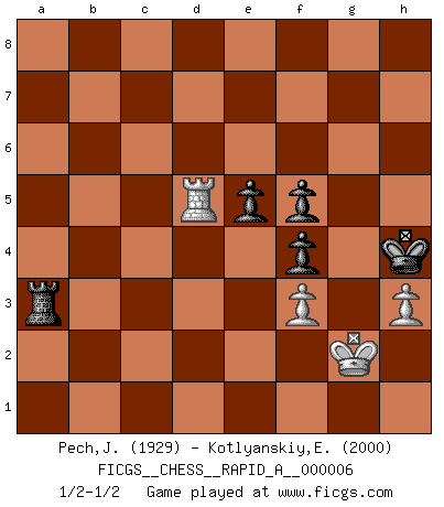 Last move : 1/2-1/2 2007 February 16 21:19:44 [Event "FICGS__CHESS__RAPID_A__000006"] [Site "FICGS"] [Date "2006.12.03"] [Round "1"] [White "Pech,Jaroslav"] [Black "Kotlyanskiy,Edward"] [Result "1/2-1/2"] [WhiteElo "1929"] [BlackElo "2000"] 1.d4 Nf6 2.c4 e6 3.Nc3 Bb4 4.e3 O-O 5.Bd3 d5 6.Nf3 c5 7.O-O cxd4 8.exd4 dxc4 9.Bxc4 b6 10.Bg5 Bb7 11.Qe2 Nbd7 12.Rac1 Rc8 13.Ne5 Be7 14.Ba6 Bxa6 15.Qxa6 Nxe5 16.dxe5 Nd5 17.Bxe7 Nxe7 18.Qxa7 Nc6 19.Qb7 Nxe5 20.Rcd1 Qc7 21.Qxc7 Rxc7 22.Rfe1 Nc4 23.Re2 Nxb2 24.Rxb2 Rxc3 25.Rxb6 Ra3 26.Rb2 g5 27.Rd7 Kg7 28.g3 Kg6 29.Kg2 h5 30.h3 f6 31.g4 Ra4 32.gxh5+ Kxh5 33.Rd3 e5 34.a3 Kg6 35.Rb6 Rfa8 36.Rf3 Rf4 37.Rxf4 gxf4 38.Rb3 Kg5 39.Rd3 f5 40.f3 Kh4 41.Rd5 Rxa3 1/2-1/2 Nimzo-Indian : 4.e3 O-O, 5.Bd3 d5 Kingside Castling by player Black (move 4) Kingside Castling by player White (move 7) 10 pieces endgame at move 37 : White KRPPP , Black KRPPP WHITE : King + 1 Rook 3 Pawns BLACK : King + 1 Rook 3 Pawns 9 pieces endgame at move 41 : White KRPP , Black KRPPP WHITE : King + 1 Rook 2 Pawns BLACK : King + 1 Rook 3 Pawns This chess game ended in a draw. Follow this game move after move (download)After a bad opening, there is hope for the middle game. After a bad middle game, there is hope for the endgame. But once you are in the endgame, the moment of truth has arrived. (Edmar Mednis) Zu meiner Zeit war ein 20 jähriger ein junger Spieler, heute ist er ein Veteran. (Garry Kasparov) El Ajedrez, como cualquier otra actividad creativa, puede existir solo a través de méritos combinados de aquellos que tienen talento creativo y de aquellos que tienen la habilidad de organizar un trabajo creativo. (Mikhail Botvinnik) Le thème de l'attaque double intervient d'une manière ou d'une autre dans l'immense majorité des combinaisons. (Youri Averbakh) Those parts of the system that you can hit with a hammer (not advised) are called hardware; those program instructions that you can only curse at are called software. (Anonymous)