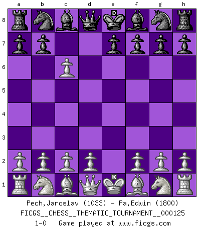 Last move : 1-0 2011 February 5 10:2:39 [Event "FICGS__CHESS__THEMATIC_TOURNAMENT__000125"] [Site "FICGS"] [Date "2010.12.11"] [Round "1"] [White "Pech,Jaroslav"] [Black "Pa,Edwin"] [Result "1-0"] [WhiteElo "1033"] [BlackElo "1800"] 1.e4 d5 2.exd5 c6 3.dxc6 1-0 This chess game has been lost on time (started : 2010.12.11 23:12:10) Scandinavian (centre counter) defense Player White won this chess game. Follow this game move after move (download)You cannot play at Chess if you are kind-hearted. (French Proverb) Ich war schon mal beim Dopingtest. Da musste ich Urin abgeben, während Dritte zusahen. (Elisabeth Pähtz) Un Peón pasado es un criminal, quién debe ser mantenido bajo candado y llave. Leves medidas, tales como vigilancia policiaca, no son suficientes. (Aaron Nimzovich) Le moment que je préfère le plus dans une rencontre, c'est celui où je sens que la personnalité de l'adversaire se brise. (Robert Fischer) Now you put water in a cup, it becomes the cup; You put water into a bottle it becomes the bottle; You put it in a teapot it becomes the teapot. Water can flow or it can crash. Be water, my friend. (Bruce Lee)