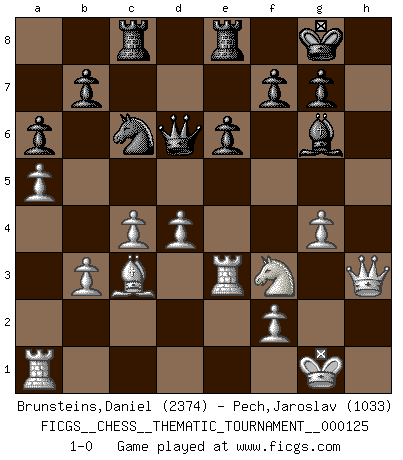 Last move : 1-0 2011 September 18 22:33:4 [Event "FICGS__CHESS__THEMATIC_TOURNAMENT__000125"] [Site "FICGS"] [Date "2010.12.11"] [Round "1"] [White "Brunsteins,Daniel"] [Black "Pech,Jaroslav"] [Result "1-0"] [WhiteElo "2374"] [BlackElo "1033"] 1.e4 d5 2.exd5 c6 3.dxc6 Nxc6 4.Nf3 Bg4 5.Bb5 Nf6 6.h3 Bh5 7.O-O e6 8.d3 Rc8 9.Nbd2 Qd5 10.a4 a6 11.Bxc6+ Qxc6 12.g4 Bg6 13.Nc4 Bd6 14.Bd2 O-O 15.Nxd6 Qxd6 16.Re1 Qb6 17.b3 Nd7 18.a5 Qc7 19.c4 h5 20.d4 hxg4 21.hxg4 Rfe8 22.Nh4 Bh7 23.Qf3 Nb8 24.Qh3 Nc6 25.Nf3 Qd6 26.Bc3 Bg6 27.Re3 1-0 This chess game has been lost on time (started : 2010.12.11 23:12:10) Scandinavian (centre counter) defense Kingside Castling by player White (move 7) Kingside Castling by player Black (move 14) Player White won this chess game. Follow this game move after move (download)We must make sure that Chess will not be like a dead language, very interesting, but for a very small group. (Sytze Faber) Kein Großmeister ist normal. Sie unterscheiden sich nur im Ausmaß Ihrer Verrücktheit. (Viktor Kortschnoi) El Ajedrez es una hermosa aventura. (Bent Larsen) Des points faibles ou des trous dans la position de l'adversaire doivent être occupés par des pièces et non pas par des pions. (Siegbert Tarrasch) Work expands to fill the time available. (C. Northcote Parkinson, in Parkinson's Laws)