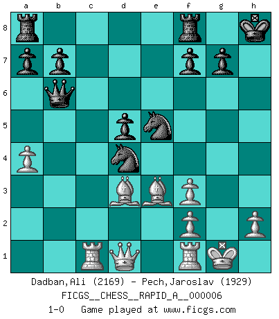 Last move : 1-0 2007 February 4 14:47:2 [Event "FICGS__CHESS__RAPID_A__000006"] [Site "FICGS"] [Date "2006.12.03"] [Round "1"] [White "Dadban,Ali"] [Black "Pech,Jaroslav"] [Result "1-0"] [WhiteElo "2169"] [BlackElo "1929"] 1.e4 e6 2.d4 d5 3.Nc3 Bb4 4.e5 c5 5.a3 Bxc3+ 6.bxc3 Ne7 7.a4 Nbc6 8.Nf3 Qa5 9.Bd2 Bd7 10.c4 Qc7 11.cxd5 exd5 12.c3 O-O 13.Bd3 cxd4 14.cxd4 Bg4 15.Bxh7+ Kh8 16.Bd3 Nxd4 17.Rc1 Nec6 18.Be3 Qa5+ 19.Bd2 Qb6 20.O-O Nxe5 21.Be3 Bxf3 22.gxf3 1-0 This chess game has been lost on time (started : 2006.12.03 10:30:27) French : Winawer, Advance, Smyslov variation Kingside Castling by player Black (move 12) Kingside Castling by player White (move 20) Player White won this chess game. Follow this game move after move (download)Different people feel differently about resigning. (Bobby Fischer) Als er Schachweltmeister wurde ließ er praktisch alle stärksten Sovietspieler für sich arbeiten. Wenn ein auch nur mittelmässiger Meister ein Spezialist für eine bestimmte Eröffnung war, wurde er von Karpov gerufen. Das wurde alles geheim gehalten. (Mikhail Moiseyevich Botvinik) No hay precio que sea tan grande por la cabellera del Rey enemigo. (Koblentz) Des idées, des idées, j'en ai cent, j'en ai mille. Des bonnes, des mauvaises, applicables, irréalisables... Il suffit de faire le tri ! (Roos) Programming can only do so much before it becomes too much. (Don Groves)