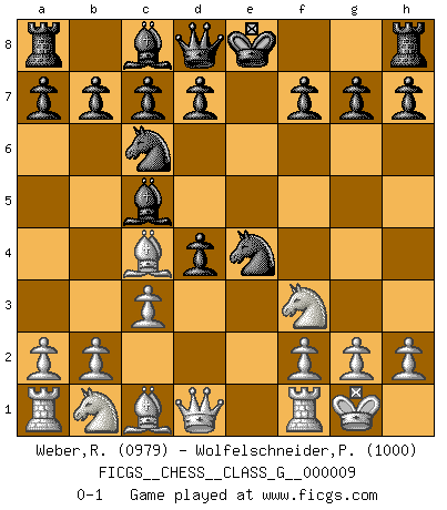 Last move : 0-1 2007 January 16 12:27:52 [Event "FICGS__CHESS__CLASS_G__000009"] [Site "FICGS"] [Date "2006.12.03"] [Round "1"] [White "Weber,Roger"] [Black "Wolfelschneider,Peter"] [Result "0-1"] [WhiteElo "0979"] [BlackElo "1000"] 1.e4 e5 2.Nf3 Nc6 3.Bc4 Nf6 4.O-O Bc5 5.c3 Nxe4 6.d4 exd4 0-1 This chess game has been lost on time (started : 2006.12.03 22:27:16) Two knights defense Kingside Castling by player White (move 4) Player Black won this chess game. Follow this game move after move (download)I believe that Chess possesses a magic that is also a help in advanced age. A rheumatic knee is forgotten during a game of Chess and other events can seem quite unimportant in comparison with a catastrophe on the chessboard. (Vlastimil Hort) Je mehr wir mit Computern analysieren, desto mehr glauben wir an Verteidigung. (Vladimir Kramnik) Bobby Fischer es el mas grande genio de Ajedrez de todos los tiempos. (Alexander Kotov) C'est la seule position que je connaisse où les deux camps sont mals. Propos prêtés à V. Anand. History is the quarrels of popes and kings, with wars or pestilences in every page; the men all so good for nothing, and hardly any women at all. (Jane Austen)
