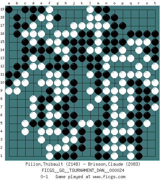 Last move : 0-1 2011 March 18 14:30:33 [Event "FICGS__GO__TOURNAMENT_DAN__000024"] [Site "FICGS"] [Date "2010.12.15"] [Round "1"] [Black "Pillon,Thibault"] [White "Brisson,Claude"] [Result "0-1"] [Rating 1 "2148"] [Rating 2 "2083"] 1.q16 d17 2.r4 e3 3.p3 r11 4.c15 f17 5.c12 r14 6.o17 c4 7.k3 c10 8.r8 e10 9.c17 c18 10.b18 c16 11.b17 d16 12.b16 m17 13.s16 s15 14.t16 h3 15.j5 j4 16.k4 k5 17.j6 l5 18.m3 l7 19.j8 l9 20.j10 l11 21.h4 j3 22.e5 g4 23.h5 d7 24.e7 d6 25.e8 d8 26.p8 f6 27.g7 h9 28.j9 g10 29.j12 j16 30.g12 n4 31.n3 f13 32.k13 m15 33.f12 d13 34.m13 p11 35.n11 n10 36.o10 o11 37.m10 n9 38.m11 o9 39.m9 m8 40.n8 o8 41.n7 o7 42.n6 o6 43.n5 o5 44.m4 o4 45.m5 o3 46.q10 p10 47.r10 q11 48.q6 p2 49.q3 q2 50.n18 m18 51.c13 d15 52.c14 e12 53.b11 b10 54.a10 a9 55.a11 b9 56.r2 n2 57.m2 r6 58.r7 n13 59.l12 p16 60.p17 q15 61.r16 o16 62.e6 e4 63.d5 c5 64.m19 l19 65.n19 l18 66.j2 h2 67.k2 c11 68.b12 h13 69.j14 h14 70.j15 h16 71.h12 s10 72.s9 s11 73.d18 e18 74.s14 s13 75.t14 r15 76.t15 n17 77.o18 q5 78.r5 q7 79.s6 q9 80.r9 q8 81.p7 p9 82.g5 f4 83.f9 f10 84.h15 g15 85.h1 g2 86.g1 f2 87.n14 n12 88.m12 m14 89.r13 q13 90.p15 r12 91.o14 p13 92.n16 p14 93.n15 m16 94.c19 f5 95.d14 f7 96.f8 g8 97.h8 g9 98.e14 f15 99.f14 g14 100.e15 e16 101.e13 d12 102.k16 k17 103.n1 o2 104.l16 k15 105.l15 l14 106.k14 l17 107.k15 j17 108.r1 p6 109.t13 t12 110.e19 f19 111.d19 f1 112.j1 g6 113.h7 o13 114.o15 t9 115.t8 t10 116.g13 t7 117.s8 r6 118.s7 s5 119.q6 p16 120.o16 r6 121.g18 f18 122.q6 b19 123.a19 r6 124.j13 g16 125.q6 q4 126.r6 p4 127.r3 o1 128.m1 f11 129.h11 q1 130.h6 h10 131.l13 g11 0-1 Here are the names of the openings (joseki) played in the four corners : Corner q16 : q16 r11 Hoshi (Hwajeom, Seongjeom, Xingwei`) 4-4 Point. The star or hoshi (4-4) point, emphasizing influence at the potential expense of territory. Corner d16 : d17 c15 Komoku (Somok, Xiao~mu`) 3-4 Point. The komoku (3-4) point is the traditional corner enclosure move.. Ikken Kakari (Hankan Keolch'im, Yi Gua`jiao~, 1-Space Low Pincer). The small knight move is the basic approach move to the 3-4 point stone. It has been continually used for over four centuries. There are limitless variations, with new moves constantly being discovered. Black 2 opens the door to a treaure store of joseki. Player White won this Go (weiqi, baduk) game. Follow this game move after move (download)When your opponent has two weak groups, attack them both at once. (Anonymous) Nothing is more important for teaching us to understand the concepts we have than constructing fictitious ones. (Ludwig Wittgenstein)