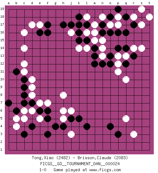 Last move : 1-0 2011 January 15 22:23:31 [Event "FICGS__GO__TOURNAMENT_DAN__000024 "] [Site "FICGS"] [Date "2010.12.15"] [Round "1"] [Black "Tong,Xiao "] [White "Brisson,Claude "] [Result "1-0"] [Rating 1 "2482"] [Rating 2 "2083"] 1.q16 c16 2.d4 r3 3.e16 e17 4.f17 d17 5.f16 c14 6.k16 r14 7.o16 q10 8.o4 q5 9.l4 c6 10.f3 b4 11.c3 d10 12.c8 d8 13.c9 d9 14.c7 d6 15.c10 c11 16.b11 c12 17.b6 b5 18.a7 c5 19.d7 e7 20.e6 e5 21.f6 j3 22.j5 h5 23.f5 j6 24.k5 h8 25.h4 h6 26.p3 f7 27.g4 k17 28.j17 j16 29.h17 l16 30.k15 m17 31.l15 m15 32.m14 n15 33.k18 p17 34.p16 o17 35.n16 m16 36.n17 n18 37.q14 q13 38.p14 n14 39.r13 l14 40.m13 k14 41.l17 l18 42.k17 n13 43.m12 s14 44.q12 p13 45.o13 p12 46.o12 p11 47.n12 r18 48.r17 s17 49.s18 s19 50.q18 t18 51.o18 p18 52.p19 1-0 Here are the names of the openings (joseki) played in the four corners : Corner d16 : c16 e16Komoku (Somok, Xiao~mu`) 3-4 Point. The komoku (3-4) point is the traditional corner enclosure move..Ikken Takagakari (Hankan Nop'dakeolch'im, Yi Gaogua`jiao~, 1-Space High Approach). The 5-4 approach move has become more popular in modern times, as modern Go emphasizes speed and influence. Corner q16 : q16 r14Hoshi (Hwajeom, Seongjeom, Xingwei`) 4-4 Point. The star or hoshi (4-4) point, emphasizing influence at the potential expense of territory.Ikken Kakari (Hankan Keolch'im, Yi Gua`jiao~, 1-Space Low Approach). White 2 is the standard approach move to the 4-4. Corner q4 : r3 o4San-San (Sam-Sam, San-San) 3-3 Point. The San-San (3-3) point, emphasizing territory at the expense of influence.Niken Takagakari (Dukan Nop'dakeolch'im, E`r Gaogua`jiao~, 2-Space High Approach). White may continue with 4-5 or 4-6. White 4-6 works well when White is in the lower right (so an extension in the middle works both ways). The more conservative 4-5 is makes a slightly tighter shape (better for a fight). Corner d4 : d4 c6Hoshi (Hwajeom, Seongjeom, Xingwei`) 4-4 Point. The star or hoshi (4-4) point, emphasizing influence at the potential expense of territory.Ikken Kakari (Hankan Keolch'im, Yi Gua`jiao~, 1-Space Low Approach). White 2 is the standard approach move to the 4-4. Player Black won this Go (weiqi, baduk) game.Follow this game move after move (download ) Only amateurs try to come up with fancy moves. (Anonymous) May I never be complete. May I never be content. May I never be perfect. Deliver me, Tyler, from being perfect and complete. (Chuck Palahniuk, Fight Club)