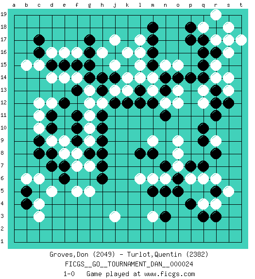 Last move : 1-0 2011 February 11 8:34:38 [Event "FICGS__GO__TOURNAMENT_DAN__000024"] [Site "FICGS"] [Date "2010.12.15"] [Round "1"] [Black "Groves,Don"] [White "Turlot,Quentin"] [Result "1-0"] [Rating 1 "2049"] [Rating 2 "2382"] 1.r16 d16 2.q3 d5 3.p17 j3 4.r5 m3 5.d10 c12 6.e12 c10 7.q10 j17 8.m17 f16 9.c9 d9 10.d11 c11 11.c8 e9 12.b5 c4 13.b4 c3 14.d8 e8 15.e7 c6 16.d7 b6 17.g8 g9 18.h9 g10 19.h10 g11 20.h11 g12 21.h7 h12 22.j12 r15 23.q15 r14 24.q14 s16 25.s17 r17 26.q16 s18 27.r18 t17 28.q17 s17 29.h13 j13 30.j14 k13 31.g14 k14 32.f13 g13 33.h14 f14 34.f15 e14 35.e15 d14 36.g16 e16 37.k15 j15 38.k12 m14 39.g17 h16 40.g15 l16 41.f9 f8 42.f10 g7 43.h8 f7 44.l12 m13 45.m12 l17 46.e6 g5 47.d15 c15 48.c16 b15 49.c17 d12 50.f11 n12 51.l13 l14 52.n13 o12 53.o14 q13 54.r13 s13 55.r12 q12 56.r11 o9 57.m18 k16 58.s12 q18 59.p18 r19 60.n7 o15 61.p14 o13 62.n14 o7 63.o6 r9 64.q9 o8 65.q7 n6 66.n5 m6 67.m8 m9 68.h6 f5 69.m5 l6 70.l8 p6 71.o5 q6 72.p7 r6 73.r8 n15 74.m15 l15 75.m16 q4 76.p4 r4 77.r3 s5 78.n3 s14 79.n11 1-0 Here are the names of the openings (joseki) played in the four corners : Player Black won this Go (weiqi, baduk) game. Follow this game move after move (download)Win the stones, lose the game. (Anonymous) Work expands to fill the time available. (C. Northcote Parkinson, in Parkinson's Laws)
