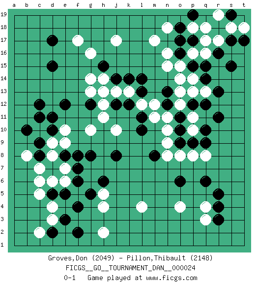 Last move : 0-1 2011 January 25 0:50:11 [Event "FICGS__GO__TOURNAMENT_DAN__000024"] [Site "FICGS"] [Date "2010.12.15"] [Round "1"] [Black "Groves,Don"] [White "Pillon,Thibault"] [Result "0-1"] [Rating 1 "2049"] [Rating 2 "2148"] 1.r16 d4 2.d17 q4 3.d15 p16 4.q14 r17 5.s17 q17 6.r11 s18 7.q6 o4 8.r5 c10 9.c12 j17 10.c8 c6 11.e8 e10 12.e12 g10 13.g8 j10 14.d10 d9 15.d11 e9 16.c9 d8 17.d7 c7 18.b10 b8 19.c11 e7 20.f8 q8 21.o6 p11 22.q10 o8 23.f4 h4 24.r4 q3 25.r3 f17 26.g5 h5 27.h6 l4 28.e3 d3 29.d2 c2 30.f2 h2 31.f7 e6 32.f6 m17 33.e5 d6 34.d5 c5 35.j8 p14 36.q15 g14 37.g12 q13 38.r13 o13 39.q12 p13 40.m8 j13 41.h13 h14 42.j12 k13 43.k12 h11 44.l10 p10 45.p12 o12 46.o11 n11 47.o10 n10 48.o9 n9 49.p9 p8 50.q9 n8 51.p15 o15 52.n12 l12 53.n13 o14 54.l13 m11 55.l11 m12 56.l14 h12 57.j14 g13 58.k14 h13 59.h15 g16 60.o16 n16 61.o17 n15 62.p17 q16 63.s15 p18 64.o18 q18 65.p19 n18 66.s19 t18 67.t17 r19 0-1 Here are the names of the openings (joseki) played in the four corners : Corner q16 : r16 p16 Komoku (Somok, Xiao~mu`) 3-4 Point. The komoku (3-4) point is the traditional corner enclosure move.. Ikken Takagakari (Hankan Nop'dakeolch'im, Yi Gaogua`jiao~, 1-Space High Approach). The 5-4 approach move has become more popular in modern times, as modern Go emphasizes speed and influence. Corner q4 : q4 q6 Hoshi (Hwajeom, Seongjeom, Xingwei`) 4-4 Point. The star or hoshi (4-4) point, emphasizing influence at the potential expense of territory. Ikken Takagakari (Hankan Nop'dakeolch'im, Yi Gaojia, 1-Space High Approach). White typically responds at 6-4 or 3-10. White 4-10 is played when White finds play on the right side advantageous. White 4-8 or 3-8 may be played when White has support at top. Corner d4 : d4 c8 Hoshi (Hwajeom, Seongjeom, Xingwei`) 4-4 Point. The star or hoshi (4-4) point, emphasizing influence at the potential expense of territory. Player White won this Go (weiqi, baduk) game. Follow this game move after move (download)One big eye kills one small eye. (Anonymous) Rules and bones are meant to be broken. (Anonymous)
