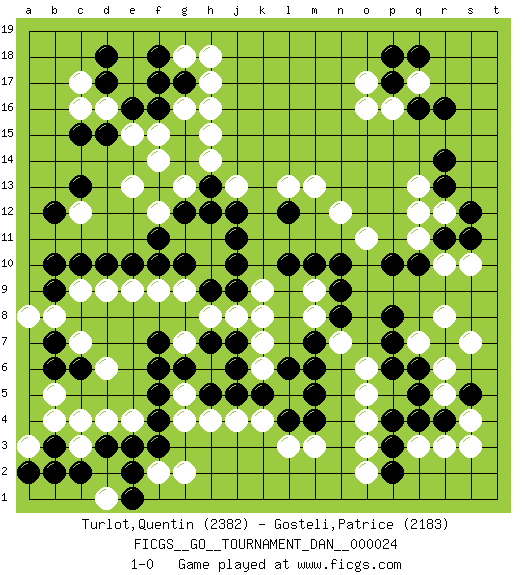 Last move : 1-0 2011 April 8 15:10:40 [Event "FICGS__GO__TOURNAMENT_DAN__000024"] [Site "FICGS"] [Date "2010.12.15"] [Round "1"] [Black "Turlot,Quentin"] [White "Gosteli,Patrice"] [Result "1-0"] [Rating 1 "2382"] [Rating 2 "2183"] 1.q16 d4 2.d15 r3 3.q10 r8 4.p8 r10 5.r11 q11 6.p10 r12 7.s11 s10 8.s12 q12 9.r13 q13 10.r14 n12 11.q6 r6 12.q5 r5 13.q4 q7 14.p7 q3 15.p3 m13 16.f3 o6 17.p6 k4 18.f5 o4 19.p4 o3 20.r4 s4 21.p2 o2 22.m7 n7 23.m6 o5 24.n8 m8 25.n9 k8 26.l10 m9 27.m10 k9 28.l12 o11 29.n10 l13 30.j11 q17 31.p17 p16 32.r16 o17 33.p18 o16 34.q18 j13 35.k5 j4 36.l4 l3 37.m4 m3 38.j5 h4 39.h5 g4 40.f4 g5 41.g6 h6 42.j7 h10 43.h7 g7 44.f6 h11 45.j10 h8 46.h9 g9 47.j9 j8 48.h12 k7 49.j6 f12 50.g10 g11 51.f10 f9 52.e10 e9 53.d10 d9 54.c10 c9 55.j12 d6 56.d3 c3 57.c2 c4 58.e2 l5 59.l6 k6 60.m5 g2 61.b3 b4 62.b2 f2 63.b9 b8 64.b10 c7 65.d17 e13 66.c13 d16 67.e16 c16 68.c15 c12 69.b12 e15 70.f16 f14 71.g12 c17 72.d18 g16 73.g17 f15 74.f11 h17 75.f18 g18 76.f17 h18 77.g15 h16 78.g14 g13 79.h13 h14 80.f13 e4 81.e3 g13 82.s5 s3 83.f13 d1 84.e1 g13 85.r7 s7 86.f13 a3 87.a2 g13 88.f7 h15 89.b6 b5 90.b7 a8 91.c6 1-0 Here are the names of the openings (joseki) played in the four corners : Corner d4 : d4 f3 Hoshi (Hwajeom, Seongjeom, Xingwei`) 4-4 Point. The star or hoshi (4-4) point, emphasizing influence at the potential expense of territory. Ikken Kakari (Hankan Keolch'im, Yi Gua`jiao~, 1-Space Low Approach). Black 2 is the standard approach move to the 4-4. Player Black won this Go (weiqi, baduk) game. Follow this game move after move (download)Against three in a row, play right in the center. (Anonymous) Luck never made a man wise. (Seneca, Letters to Lucilius)