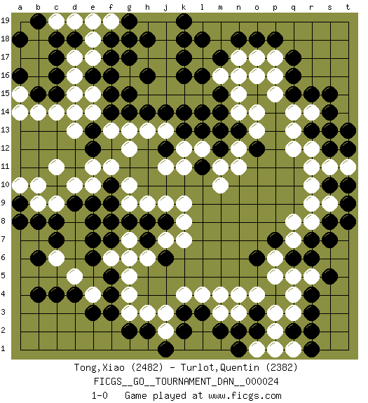 Last move : 1-0 2011 February 11 8:34:27 [Event "FICGS__GO__TOURNAMENT_DAN__000024"] [Site "FICGS"] [Date "2010.12.15"] [Round "1"] [Black "Tong,Xiao"] [White "Turlot,Quentin"] [Result "1-0"] [Rating 1 "2482"] [Rating 2 "2382"] 1.q16 q4 2.d4 d16 3.o3 m3 4.r3 q3 5.r4 q5 6.q2 p2 7.r2 p3 8.r6 j3 9.f17 c14 10.k16 c6 11.f3 d10 12.b4 o17 13.p18 r14 14.r15 q14 15.o15 m16 16.m15 l15 17.l16 n15 18.m14 n14 19.n16 o16 20.m17 p15 21.o18 o14 22.c17 d17 23.d18 e18 24.c18 e17 25.b15 b14 26.c15 d15 27.f18 e19 28.c16 h17 29.f15 h15 30.h18 j17 31.g17 e14 32.f14 j18 33.h14 j15 34.e13 d13 35.j14 k15 36.k13 h19 37.g18 f13 38.g14 g12 39.m13 e4 40.e3 d5 41.c4 g5 42.f10 j11 43.f7 g6 44.h8 k9 45.e12 e11 46.d9 c9 47.c10 e10 48.e9 f11 49.c8 b9 50.c7 b10 51.b6 l12 52.l13 r8 53.r7 q8 54.s14 s13 55.s15 j7 56.p7 q7 57.q6 p6 58.o2 o1 59.h2 n12 60.m2 o4 61.l3 m4 62.k2 l4 63.m12 m11 64.n13 o13 65.o6 p5 66.l11 m10 67.o12 n11 68.s8 s9 69.s7 n17 70.n18 m16 71.l18 k12 72.j12 k11 73.n16 d19 74.a18 m16 75.g15 n16 76.s12 r12 77.t13 s11 78.r13 q12 79.k3 k4 80.n1 j2 81.j1 h3 82.g2 p1 83.h7 f8 84.e7 g7 85.g8 h6 86.j8 k8 87.j6 k7 88.f5 g9 89.f9 h9 90.e8 j9 91.f8 f6 92.e6 g4 93.f4 p17 94.q17 r5 95.s5 c19 96.b19 g10 97.b8 q1 98.r1 n4 99.n2 j13 100.k14 h13 101.k18 g13 102.g19 j19 103.k17 q13 104.s13 g3 105.a9 c11 106.t8 a15 107.a16 a14 108.s10 r10 109.t10 a10 110.a8 t11 111.t9 r9 112.f16 f19 113.h16 j16 114.k19 d14 115.l14 r11 116.q15 p16 117.t12 n3 118.e16 e15 119.pass 1-0 Here are the names of the openings (joseki) played in the four corners : Corner q4 : q4 o3 Hoshi (Hwajeom, Seongjeom, Xingwei`) 4-4 Point. The star or hoshi (4-4) point, emphasizing influence at the potential expense of territory. Ikken Kakari (Hankan Keolch'im, Yi Gua`jiao~, 1-Space Low Approach). Black 2 is the standard approach move to the 4-4. Corner d4 : d4 j3 Hoshi (Hwajeom, Seongjeom, Xingwei`) 4-4 Point. The star or hoshi (4-4) point, emphasizing influence at the potential expense of territory. Corner d16 : d16 f17 Hoshi (Hwajeom, Seongjeom, Xingwei`) 4-4 Point. The star or hoshi (4-4) point, emphasizing influence at the potential expense of territory. Ikken Kakari (Hankan Keolch'im, Yi Gua`jiao~, 1-Space Low Approach). Black 2 is the standard approach move to the 4-4. Corner q16 : q16 o17 Hoshi (Hwajeom, Seongjeom, Xingwei`) 4-4 Point. The star or hoshi (4-4) point, emphasizing influence at the potential expense of territory. Ikken Kakari (Hankan Keolch'im, Yi Gua`jiao~, 1-Space Low Approach). White 2 is the standard approach move to the 4-4. Player Black won this Go (weiqi, baduk) game. Follow this game move after move (download)Answer the keima with a kosumi. (Anonymous) Dave, my mind is going. I can feel it. (HAL 9000 in 2001, a space odyssey)