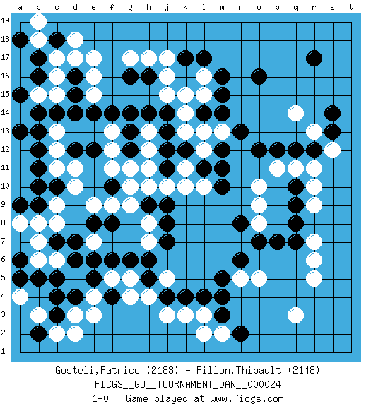 Last move : 1-0 2011 January 7 22:53:24 [Event "FICGS__GO__TOURNAMENT_DAN__000024"] [Site "FICGS"] [Date "2010.12.15"] [Round "1"] [Black "Gosteli,Patrice"] [White "Pillon,Thibault"] [Result "1-0"] [Rating 1 "2183"] [Rating 2 "2148"] 1.r17 d17 2.c5 q3 3.o16 r5 4.d15 e15 5.e14 e16 6.d14 c16 7.d16 e17 8.g14 d3 9.f4 d5 10.d4 e4 11.c4 e3 12.e5 f5 13.d6 g4 14.f6 g5 15.g6 r11 16.h5 h4 17.j4 j5 18.h6 j3 19.k4 k3 20.l4 l3 21.m4 q14 22.q10 r10 23.q9 j16 24.h16 h17 25.g16 g17 26.k17 j17 27.j14 c11 28.b14 c8 29.b9 b8 30.c10 d10 31.b11 c12 32.b12 c9 33.b10 e7 34.e6 g9 35.j9 h11 36.f10 f11 37.j11 g10 38.m3 m2 39.n2 l2 40.s14 r9 41.q8 r7 42.q7 r6 43.q12 o5 44.n6 r13 45.r12 s12 46.s13 q11 47.p12 p11 48.o12 l16 49.m15 l15 50.m16 o8 51.l17 j15 52.o7 o10 53.n8 o9 54.p7 b3 55.c3 c2 56.b2 d2 57.m10 h8 58.j8 h7 59.j7 n5 60.m5 l13 61.m14 c13 62.b13 b15 63.c14 f13 64.f14 h13 65.b17 c17 66.b16 c15 67.a15 b18 68.a18 b19 69.c18 a14 70.a13 d18 71.g13 f12 72.h14 k13 73.j13 h12 74.j12 m13 75.n13 k10 76.l11 j10 77.g12 g11 78.h9 h10 79.f8 f9 80.e8 e9 81.d12 d11 82.e12 b6 83.c7 b7 84.b5 c6 85.d7 a8 86.a6 a4 87.a5 k11 88.k12 l12 89.l14 k14 90.m12 k15 91.a9 l10 92.m11 1-0 Here are the names of the openings (joseki) played in the four corners : Corner d16 : d17 d15 Komoku (Somok, Xiao~mu`) 3-4 Point. The komoku (3-4) point is the traditional corner enclosure move.. Ikken Takagakari (Hankan Nop'dakeolch'im, Yi Gaogua`jiao~, 1-Space High Approach). The 5-4 approach move has become more popular in modern times, as modern Go emphasizes speed and influence. Corner d4 : c5 d3 Mokuhazushi (Waemok, Wai`mu`) 5-3 Point. The mokuhazushi (5-3) point was popular in the Edo period in Japan (1600 - 1867). It emphasizes influence; territorially, it is inferior to the 3-4 point. Komoku Kakari. White 2 is the standard approach because of its solidity and stability. Player Black won this Go (weiqi, baduk) game. Follow this game move after move (download)Don't be greedy ! (Anonymous) After growing wildly for years, the field of computing appears to be reaching its infancy. (John Pierce)