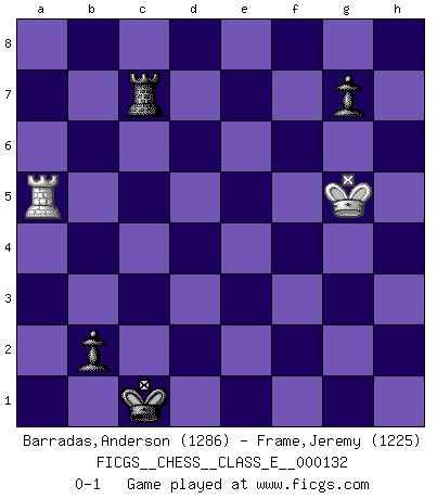 Last move : 0-1 2011 January 2 5:58:7 [Event "FICGS__CHESS__CLASS_E__000132"] [Site "FICGS"] [Date "2010.12.15"] [Round "1"] [White "Barradas,Anderson"] [Black "Frame,Jeremy"] [Result "0-1"] [WhiteElo "1286"] [BlackElo "1225"] 1.e4 e5 2.Nf3 Nf6 3.Nxe5 d6 4.Nf3 Nxe4 5.d4 Qe7 6.Be3 d5 7.a3 Bg4 8.Be2 Nd7 9.Nc3 Nxc3 10.bxc3 Qd8 11.O-O Bd6 12.Re1 O-O 13.h3 Bh5 14.Nh2 Bxe2 15.Qxe2 Re8 16.Ng4 Bf4 17.Qf3 Bxe3 18.Rxe3 Rxe3 19.Nxe3 Nf6 20.c4 c6 21.cxd5 Nxd5 22.c4 Nxe3 23.Qxe3 Qe8 24.Qb3 b6 25.g4 Qe4 26.Rd1 Rd8 27.d5 cxd5 28.cxd5 Kf8 29.d6 Qc6 30.Qb4 f6 31.d7 Kf7 32.Rd6 Qc7 33.Qb3+ Ke7 34.Qe6+ Kf8 35.g5 Qc1+ 36.Kh2 Qf4+ 37.Kg1 Qxg5+ 38.Qg4 Qxg4+ 39.hxg4 Ke7 40.Rd1 Rxd7 41.Re1+ Kd6 42.Rd1+ Kc6 43.Rc1+ Kb5 44.Rc8 Ka4 45.Rc3 a5 46.Kg2 b5 47.f3 b4 48.axb4 axb4 49.Rc4 h6 50.Rf4 Ka3 51.Rf5 Rb7 52.Ra5+ Kb2 53.Kh3 b3 54.Kh4 Kb1 55.f4 b2 56.Kh5 Rc7 57.g5 hxg5 58.fxg5 fxg5 59.Kxg5 Kc1 0-1 Petrov : Classical attack Kingside Castling by player White (move 11) Kingside Castling by player Black (move 12) 10 pieces endgame at move 48 : White KRPP , Black KRPPPP WHITE : King + 1 Rook 2 Pawns BLACK : King + 1 Rook 4 Pawns 9 pieces endgame at move 57 : White KRP , Black KRPPPP WHITE : King + 1 Rook 1 Pawn BLACK : King + 1 Rook 4 Pawns 8 pieces endgame at move 58 : White KRP , Black KRPPP WHITE : King + 1 Rook 1 Pawn BLACK : King + 1 Rook 3 Pawns 7 pieces endgame at move 58 : White KR , Black KRPPP WHITE : King + 1 Rook BLACK : King + 1 Rook 3 Pawns 6 pieces endgame at move 59 : White KR , Black KRPP WHITE : King + 1 Rook BLACK : King + 1 Rook 2 Pawns Player Black won this chess game. Follow this game move after move (download)We don't really know how the game was invented, though there are suspicions. As soon as we discover the culprits, we'll let you know. (Bruce Pandolfini) Die starken Figuren des Gegners muss man abtauschen. (José Raúl Capablanca) El Ajedrez lo es todo: arte, ciencia y deporte. (Anatoly Karpov) Un millionnaire : 'Monsieur Steinitz ! Vous ne participez aux tournois que pour l'argent, alors que moi je n'y viens que pour l'honneur.' Steinitz : 'Chacun joue pour ce qu'il n'a pas'... Perfection is achieved, not when there is nothing more to add, but when there is nothing left to take away. (Antoine de Saint-Exupéry)