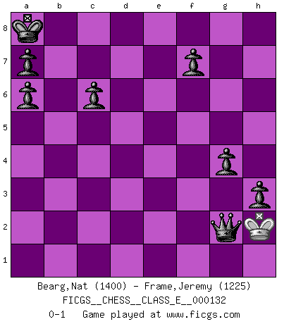 Last move : 0-1 2011 February 2 22:8:9 [Event "FICGS__CHESS__CLASS_E__000132"] [Site "FICGS"] [Date "2010.12.15"] [Round "1"] [White "Bearg,Nat"] [Black "Frame,Jeremy"] [Result "0-1"] [WhiteElo "1400"] [BlackElo "1225"] 1.a4 e5 2.Ra3 Bxa3 3.bxa3 d5 4.d4 e4 5.Nh3 Bxh3 6.gxh3 Nc6 7.e3 Nf6 8.Nc3 Qd7 9.a5 O-O-O 10.f3 exf3 11.Qxf3 Rhe8 12.Bg2 Nxa5 13.O-O c6 14.Na4 Nc4 15.Nc5 Qe7 16.Qf5+ Kb8 17.Re1 Ne4 18.a4 Ncd2 19.h4 Nxc5 20.dxc5 Nc4 21.e4 dxe4 22.Qf1 e3 23.Bf3 Nd2 24.Qe2 Nxf3+ 25.Qxf3 e2 26.Bf4+ Ka8 27.Kf2 Qxc5+ 28.Kg3 Rd1 29.Rxe2 Rxe2 30.Qxe2 Rg1+ 31.Kf3 Qh5+ 32.Kf2 Rg2+ 33.Kxg2 Qxe2+ 34.Kg3 Qxc2 35.a5 h5 36.Be5 Qf5 37.Bf4 Qg4+ 38.Kf2 Qxf4+ 39.Kg2 Qxh4 40.a6 bxa6 41.h3 g5 42.Kh2 g4 43.Kg2 Qxh3+ 44.Kg1 Qc3 45.Kg2 h4 46.Kh2 h3 47.Kg1 Qf3 48.Kh2 Qg2+ 0-1 Ware (Meadow Hay) Opening Queenside Castling by player Black (move 9) Kingside Castling by player White (move 13) 10 pieces endgame at move 40 : White KP , Black KQPPPPPP WHITE : King + 1 Pawn BLACK : King + 1 Queen 6 Pawns 9 pieces endgame at move 43 : White K , Black KQPPPPPP WHITE : King + BLACK : King + 1 Queen 6 Pawns Player Black won this chess game. Follow this game move after move (download)Pawns are born free, yet they are everywhere in chains. (Rick Kennedy) Vom Schach wurde gesagt das Leben sei dafür nicht lange genug. Aber das ist der Fehler des Lebens, nicht des Schach'. (Irving Chernev) Aquellos que dicen entender al Ajedrez, no entienden nada. (Robert Hubner) J'ai vu le vaincu d'Echecs jouer des années durant dans l'espoir de la fête de la victoire. Car tu es plus riche de ce qu'elle existe si même elle n'est point pour toi. Ainsi de la perle du fond des mers. (Antoine de Saint-Exupéry) Humor is by far the most significant activity of the human brain. (Edward De Bono)