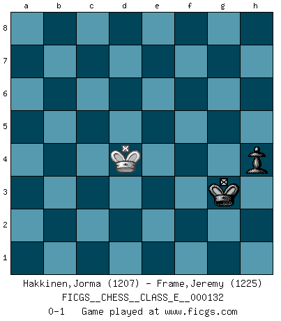 Last move : 0-1 2011 February 4 12:26:23 [Event "FICGS__CHESS__CLASS_E__000132"] [Site "FICGS"] [Date "2010.12.15"] [Round "1"] [White "Hakkinen,Jorma"] [Black "Frame,Jeremy"] [Result "0-1"] [WhiteElo "1207"] [BlackElo "1225"] 1.d4 d5 2.c4 c6 3.Nf3 e6 4.Nc3 Nf6 5.Bg5 Nbd7 6.e3 Be7 7.Be2 h6 8.Bxf6 Nxf6 9.O-O O-O 10.Qc2 b6 11.Rac1 Bb7 12.cxd5 cxd5 13.Ne5 Rc8 14.Qd3 Bd6 15.f4 Nd7 16.Nxd7 Qxd7 17.Bg4 Bb4 18.a3 Bxc3 19.Rxc3 Rxc3 20.bxc3 Rc8 21.f5 e5 22.dxe5 Qc6 23.f6 d4 24.Bf3 Qxc3 25.Qxc3 Rxc3 26.exd4 Bxf3 27.Rxf3 Rxf3 28.gxf3 gxf6 29.exf6 Kh7 30.d5 Kg6 31.Kf2 Kxf6 32.Ke3 Ke5 33.d6 Kxd6 34.Kd4 a6 35.h4 b5 36.f4 f5 37.h5 a5 38.a4 b4 39.Kc4 Kc6 40.Kd4 b3 41.Kc3 Kc5 42.Kxb3 Kd4 43.Kc2 Ke4 44.Kc3 Kxf4 45.Kc4 Kg4 46.Kb5 f4 47.Kxa5 f3 48.Kb6 f2 49.a5 f1Q 50.a6 Kxh5 51.a7 Qa1 52.Kb7 Qxa7+ 53.Kxa7 Kg4 54.Kb6 h5 55.Kc5 Kg3 56.Kd4 h4 0-1 QGD Slav : 3.Nf3 Kingside Castling by player White (move 9) Kingside Castling by player Black (move 9) 10 pieces endgame at move 31 : White KPPPP , Black KPPPP WHITE : King + 4 Pawns BLACK : King + 4 Pawns 9 pieces endgame at move 33 : White KPPP , Black KPPPP WHITE : King + 3 Pawns BLACK : King + 4 Pawns 8 pieces endgame at move 42 : White KPPP , Black KPPP WHITE : King + 3 Pawns BLACK : King + 3 Pawns 7 pieces endgame at move 44 : White KPP , Black KPPP WHITE : King + 2 Pawns BLACK : King + 3 Pawns 6 pieces endgame at move 47 : White KPP , Black KPP WHITE : King + 2 Pawns BLACK : King + 2 Pawns Promotion Queen by player Black (move 49) 5 pieces endgame at move 50 : White KP , Black KQP WHITE : King + 1 Pawn BLACK : King + 1 Queen 1 Pawn 4 pieces endgame at move 52 : White K , Black KQP WHITE : King + BLACK : King + 1 Queen 1 Pawn 3 pieces endgame at move 53 : White K , Black KP WHITE : King + BLACK : King + 1 Pawn Player Black won this chess game. Follow this game move after move (download)Bobby is the finest Chess player this country ever produced. His memory for the moves, his brilliance in dreaming up combinations, and his fierce determination to win are uncanny. (John Collins) Die Auseinandersetzung mit Karpow war politisch geprägt. Er stand für das kommunistische System, wurde von dessen Repräsentanten gehätschelt. Ich war der Oppositionelle. Jeder Schachweltmeister spiegelt auch die gesellschaftlichen Verhältnisse wider. Kramnik steht für die Börsen-Generation des Neuen Markts, ideologiefrei, zahlenfixiert. (Garry Kasparov) Cuando estes solo, cuando te sientas un extraño en el mundo, juega al Ajedrez. Esto levantará tu espiritu y será tu consejero de guerra. (Aristóteles) Plusieurs personnes se sont demandées comment Tal faisait pour gagner... En fait, c'est très simple ! Il met ses pièces au centre de l'échiquier et les sacrifie quelque part ! (David Bronstein) The existence of forgetting has never been proved: We only know that some things don't come to mind when we want them. (Friedrich Nietzsche)
