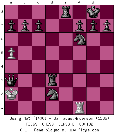 Last move : 0-1 2010 December 21 23:21:1 [Event "FICGS__CHESS__CLASS_E__000132"] [Site "FICGS"] [Date "2010.12.15"] [Round "1"] [White "Bearg,Nat"] [Black "Barradas,Anderson"] [Result "0-1"] [WhiteElo "1400"] [BlackElo "1286"] 1.a4 e5 2.Ra3 Bxa3 3.bxa3 d5 4.Bb2 Nc6 5.e3 Nf6 6.Qf3 Bg4 7.Qg3 Qd6 8.d4 e4 9.f3 Qxg3+ 10.Ke2 exf3+ 11.gxf3 Bxf3+ 12.Nxf3 Qd6 13.Bh3 O-O 14.Bc3 Rfe8 15.Bd2 Qf4 16.Rf1 Qh6 17.Bf5 Qh5 18.Bd3 Nxd4+ 19.Kd1 Nxf3 20.Bc3 Rxe3 21.Kc1 Rae8 22.Kb2 d4 23.Bb4 Qxh2 24.a5 Rxd3 25.Ka1 Qxc2 26.Bc3 dxc3 27.Nxc3 Qxc3+ 28.Kb1 Nd2+ 29.Ka2 Qxa3+ 0-1 Ware (Meadow Hay) Opening Kingside Castling by player Black (move 13) Player Black won this chess game. Follow this game move after move (download)Weak points or holes in the opponent's position must be occupied by pieces not Pawns. (Siegbert Tarrasch) Jeder weiß, dass Gasprom Putins persönliches Machtinstrument ist. Die Firma wird vom Kreml aus geleitet und wird schon deshalb nie transparent sein. (Garry Kasparov) En partidas rápidas, el Caballo es mas poderoso que el Alfil. (Vlastimil Hort) Ne tendez aucun piège pour le plaisir ! Ne jouez rien dans l'espoir que l'adversaire réagisse de façon stupide ! Prenez toujours pour acquis que l'adversaire va trouver le meilleur coup ! Ne jouez jamais de coup dans l'espoir que l'adversaire ne voie pas la menace ! Chacun de vos coups doit améliorer la position d'une façon ou d'une autre. The beginning is the most important part of the work. (Plato)