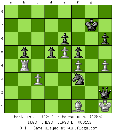Last move : 0-1 2010 December 17 17:46:38 [Event "FICGS__CHESS__CLASS_E__000132"] [Site "FICGS"] [Date "2010.12.15"] [Round "1"] [White "Hakkinen,Jorma"] [Black "Barradas,Anderson"] [Result "0-1"] [WhiteElo "1207"] [BlackElo "1286"] 1.d4 d5 2.c4 c6 3.Nf3 a6 4.Nc3 e6 5.a3 Nf6 6.Bg5 h6 7.Bh4 Be7 8.e3 Ne4 9.Bxe7 Qxe7 10.cxd5 cxd5 11.Qc2 Nc6 12.Bd3 Nxc3 13.bxc3 b5 14.O-O Na5 15.Ne5 O-O 16.a4 Bd7 17.axb5 axb5 18.Rfb1 Rfb8 19.Rb4 f6 20.Nxd7 Qxd7 21.e4 Qc6 22.e5 f5 23.f4 g6 24.g4 Kf7 25.gxf5 gxf5 26.h4 Nc4 27.Rxa8 Qxa8 28.Qd1 Rg8+ 29.Kf2 Qa2+ 30.Be2 Rg2+ 31.Ke1 Rg1+ 32.Bf1 Ne3 33.Qh5+ Kg7 34.Qf3 Nc2+ 35.Kf2 Nxd4 36.Kxg1 Nxf3+ 37.Kh1 Qh2+ 0-1 QGD Slav : 3.Nf3 Kingside Castling by player White (move 14) Kingside Castling by player Black (move 15) Player Black won this chess game. Follow this game move after move (download)If a ruler does not understand Chess, how can he rule over a kingdom ? (King Khusros II) Ein Remis kann durch Wiederholung von drei Zügen oder durch einen schlechte Zug erreicht werden. (Savielly Grigorievitsch Tartakower) El estómago es una parte esencial del maestro de Ajedrez. (Bent Larsen) Ce qui est bien, c'est d'avoir tout un tas de pièces en prise : l'adversaire ne peut en prendre qu'une à la fois. Cité par Thierry Audin. I have opinions of my own - strong opinions - but I don't always agree with them. (George Bush)