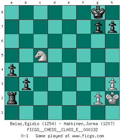 Last move : 0-1 2011 January 31 13:55:43 [Event "FICGS__CHESS__CLASS_E__000132"] [Site "FICGS"] [Date "2010.12.15"] [Round "1"] [White "Belaz,Egidio"] [Black "Hakkinen,Jorma"] [Result "0-1"] [WhiteElo "1254"] [BlackElo "1207"] 1.e4 e5 2.f4 exf4 3.Nf3 Nc6 4.d4 d5 5.exd5 Nb4 6.Bb5+ Bd7 7.Bxd7+ Qxd7 8.Bxf4 Nxd5 9.Bg3 Ngf6 10.O-O Bd6 11.c4 Ne7 12.Bxd6 cxd6 13.Re1 O-O 14.d5 Ng6 15.Nc3 Rae8 16.Rf1 Qg4 17.Nb5 Nf4 18.Rf2 Nh3+ 19.Kf1 Nxf2 20.Kxf2 Ne4+ 21.Kg1 Nc5 22.Nxd6 Re7 23.b4 Ne4 24.Qe1 f5 25.h3 Qf4 26.Nxe4 Rxe4 27.Qc3 Rxc4 28.Qd3 Rc1+ 29.Rxc1 Qxc1+ 30.Kh2 Qf4+ 31.Kg1 Rc8 32.Kh1 Rc1+ 33.Ng1 Qf1 34.Qxf1 Rxf1 35.Kh2 Rf2 36.a4 Rd2 37.Nf3 Rxd5 38.Ne1 Rd4 39.Nc2 Rc4 40.Ne3 Rxb4 41.Nxf5 Rxa4 42.Nd6 b6 43.Nb7 b5 44.Nc5 Ra2 45.Nb3 a5 46.Kg3 a4 47.Nc5 b4 48.Kh2 b3 0-1 King's knight's gambit Kingside Castling by player White (move 10) Kingside Castling by player Black (move 13) 10 pieces endgame at move 41 : White KNPP , Black KRPPPP WHITE : King + 1 Knight 2 Pawns BLACK : King + 1 Rook 4 Pawns Player Black won this chess game. Follow this game move after move (download)Good positions don't win games, good moves do. (Gerald Abrahams) Ein Schachgenie ist jemand der verdammt gut Schach spielt. (Jonathan Levitt) En el Ajedrez, tal como es jugado por los Maestros, practicamente la suerte es eliminada. (Emanuel Lasker) Toute estimation doit être constamment réévaluée. (Jacob Estrin) The man who strikes first admits that his ideas have given out. (Chinese proverb)