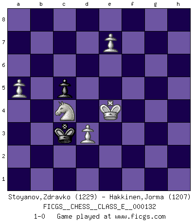 Last move : 1-0 2010 December 30 6:14:1 [Event "FICGS__CHESS__CLASS_E__000132"] [Site "FICGS"] [Date "2010.12.15"] [Round "1"] [White "Stoyanov,Zdravko"] [Black "Hakkinen,Jorma"] [Result "1-0"] [WhiteElo "1229"] [BlackElo "1207"] 1.e4 e5 2.Nf3 Nc6 3.a3 Nf6 4.d3 Bc5 5.h3 O-O 6.Be2 d6 7.Bg5 h6 8.Bh4 g5 9.Bg3 Be6 10.O-O Nh7 11.c4 f5 12.Nbd2 g4 13.b4 Bd4 14.Nxd4 Nxd4 15.hxg4 fxg4 16.Bxg4 Bxg4 17.Qxg4+ Kh8 18.Bh4 Qe8 19.Rac1 Rg8 20.Qd1 Qg6 21.Bg3 Raf8 22.c5 Ng5 23.Qg4 h5 24.Qd7 Rf7 25.Qa4 Ne2+ 26.Kh1 h4 27.Qd1 Nxg3+ 28.fxg3 Rxf1+ 29.Nxf1 hxg3 30.Qg4 Qh6+ 31.Kg1 Nh3+ 32.Qxh3 Qxh3 33.gxh3 g2 34.Ne3 Rg3 35.Kf2 Rxh3 36.Rg1 Rh1 37.Nxg2 Rxg1 38.Kxg1 Kg7 39.Nh4 dxc5 40.bxc5 Kf7 41.Kf2 Ke7 42.Ke3 Kd7 43.Ng6 Ke6 44.Kf3 b6 45.cxb6 axb6 46.Kg4 c5 47.a4 Kf6 48.Nh4 Ke6 49.Nf3 Kf6 50.Nd2 Ke6 51.Nc4 Kd7 52.Nxb6+ Kc6 53.Nc4 Kd7 54.Nxe5+ Ke6 55.Kf4 Kd6 56.a5 Kc7 57.Nc4 Kc6 58.e5 Kb5 59.e6 Kb4 60.e7 Kc3 61.Ke4 1-0 King's pawn game Kingside Castling by player Black (move 5) Kingside Castling by player White (move 10) 10 pieces endgame at move 45 : White KNPPPP , Black KPPP WHITE : King + 1 Knight 4 Pawns BLACK : King + 3 Pawns 9 pieces endgame at move 45 : White KNPPP , Black KPPP WHITE : King + 1 Knight 3 Pawns BLACK : King + 3 Pawns 8 pieces endgame at move 52 : White KNPPP , Black KPP WHITE : King + 1 Knight 3 Pawns BLACK : King + 2 Pawns 7 pieces endgame at move 54 : White KNPPP , Black KP WHITE : King + 1 Knight 3 Pawns BLACK : King + 1 Pawn Player White won this chess game. Follow this game move after move (download)It's always better to sacrifice your opponent's men. (Savielly Tartakover) Versuche, dich von der Sklaverei der Eröffnungsvarianten zu befreien. Stattdessen soll man gewisse Typenpositionen erlernen, die man eingehend analysiert. (Aaron Nimzowitsch) Con el fin de mejorar tu juego, debes de estudiar los finales antes que todo, ya que mientras que los finales pueden ser estudiados y dominados por sí mismos, el juegomedio y la apertura deben de ser estudiados en relación con los finales. (José Raúl Capablanca) Mais l'homme est une créature légère et illogique : semblable au joueur d'échecs, il n'aime que le processus du but à atteindre, non le but lui-même. (Dostoïevsky) Never was anything great achieved without danger. (Niccolo Machiavelli)