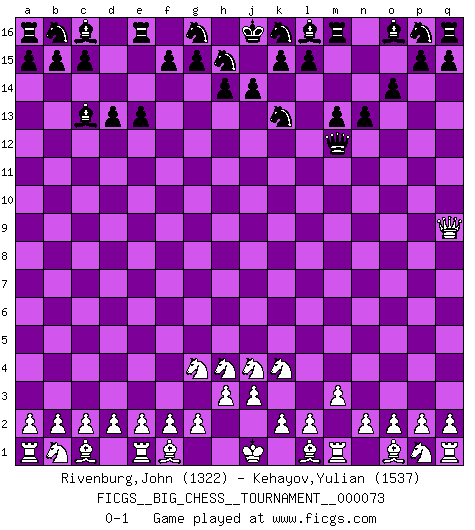 Last move : 0-1 2011 January 27 11:28:26 [Event "FICGS__BIG_CHESS__TOURNAMENT__000073"] [Site "FICGS"] [Date "2010.12.15"] [Round "1"] [White "Rivenburg,John"] [Black "Kehayov,Yulian"] [Result "0-1"] [WhiteElo "1322"] [BlackElo "1537"] 1.j2-k4 o15-o14 2.h2-j4 j15-k13 3.h1-q9 m15-m13 4.g1-j2 e15-e13 5.k1-h2 h16-m12 6.j2-h4 d15-d13 7.h2-g4 n15-n13 8.m2-m3 f16-c13 0-1 This big chess game has been lost on time (started : 2010.12.15 20:44:29) Follow this game move after move (download)Could we look into the head of a Chess player, we should see there a whole world of feelings, images, ideas, emotion and passion. (Alfred Binet) Der Knackpunkt bei der Konzentration ist, daß wir nur durch sie etwas Neues und Ungewöhnliches am Schachbrett finden können. Sie ist der einzige Weg durch neue neue Ideen eine Überraschung zu bereiten. (Garry Kasparov) Una compensación adecuada por un sacrificio es tener una combinación sólida que conduce a una posición ganadora; una compensación adecuada por una metida de pata es dejar a tu oponente arrebatar una derrota de las fauces de la victoria. (Bruce A. Moon) Karpov est une pièce de musée. (Garry Kasparov) There's always a bigger fish. (Qui-Gon Jinn in Star Wars ep.1)
