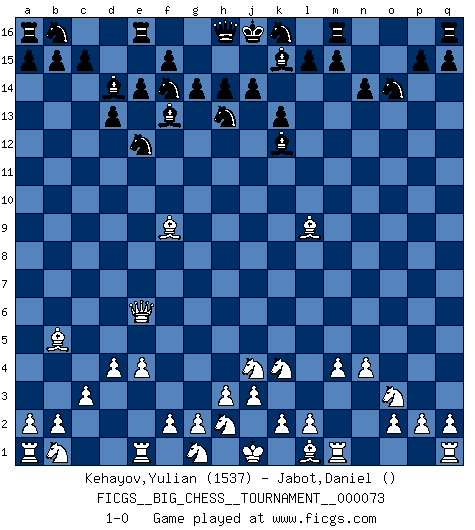 Last move : 1-0 2010 December 24 20:22:37 [Event "FICGS__BIG_CHESS__TOURNAMENT__000073"] [Site "FICGS"] [Date "2010.12.15"] [Round "1"] [White "Kehayov,Yulian"] [Black "Jabot,Daniel"] [Result "1-0"] [WhiteElo "1537"] [BlackElo ""] 1.j2-k4 k15-k13 2.h1-o7 h15-g13 3.o7-o15 p16-o14 4.o15-e6 g15-g14 5.m2-m4 d15-d13 6.e2-e4 c16-f13 7.n2-n4 e15-e14 8.d2-d4 l16-k15 9.p1-o3 f16-d14 10.c1-l9 g13-e12 11.f1-b5 n15-n14 12.o1-f9 g16-f14 13.c2-c3 o16-k12 14.k1-l3 j15-h13 15.l3-j4 1-0 Follow this game move after move (download)Dazzling combinations are for the many, shifting wood is for the few. (Georg Kieninger) Schach ist das Spiel, das die Verrückten gesund hält. (Albert Einstein) Mi estilo es algo parecido entre un poco de Tal y Petrosian. (Reshevsky) Demandez au pauvre Cg1 ce qu'il en pense. Eduard Gufeld à propos de la variante Saemisch de l'Est-Indienne. Shallow men believe in luck. Strong men belive in cause and effect. (Ralph Waldo Emerson)