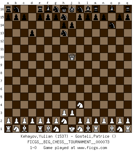 Last move : 1-0 2010 December 16 15:44:40 [Event "FICGS__BIG_CHESS__TOURNAMENT__000073"] [Site "FICGS"] [Date "2010.12.15"] [Round "1"] [White "Kehayov,Yulian"] [Black "Gosteli,Patrice"] [Result "1-0"] [WhiteElo "1537"] [BlackElo ""] 1.j2-k4 d15-d13 2.h1-o7 j15-h13 3.o7-o15 p16-o14 4.o15-e6 c16-j10 5.e6-j10 1-0 Follow this game move after move (download)Chess mastery essentially consists of analyzing Chess positions accurately. (Mikhail Botvinnik) Ich war zu klein für die Schach-Schülermannschaft! (Woody Allen) No soy una persona materialista y por eso, no resiento la falta o pérdida del dinero. La ausencia de cosas mundanas carece de importancia. Ya que el Ajedrez es una forma en la que puedo ser tan materialista como yo desee sin tener la necesidad de vender mi alma. (Jamie Walter Adams) Pour se monter efficace, un Cavalier a besoin d'avant-postes ! Les Cavaliers font les meilleurs bloqueurs de pions passés. I've lost money so fast in these clubs it's left me reeling. I've read every poker book ever written, but the only way to get better at the game is to go out and play with people who are really good. The problem is, you stand to lose a lot of money doing it. (Matt Damon)