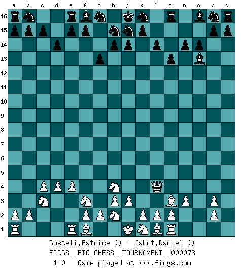 Last move : 1-0 2010 December 24 16:7:54 [Event "FICGS__BIG_CHESS__TOURNAMENT__000073"] [Site "FICGS"] [Date "2010.12.15"] [Round "1"] [White "Gosteli,Patrice"] [Black "Jabot,Daniel"] [Result "1-0"] [WhiteElo ""] [BlackElo ""] 1.c2-c4 g15-g13 2.d2-d4 h16-d12 3.g1-f3 m15-m13 4.e2-e4 o15-o14 5.j2-h4 d15-d14 6.p1-o3 d12-o2 7.n2-n3 c16-p4 8.c1-k8 p4-o3 9.k8-p3 o2-p3 10.q2-p3 o3-m1 11.h1-l4 l15-l14 12.o1-m3 l16-o13 13.q1-m1 n15-n14 14.b1-c3 1-0 Follow this game move after move (download)At this time Fischer is simply a level above all the best Chessplayers in the world. (John Jacobs) Obwohl ich vom Stil her kaum zu den Priestern der Schachkunst gezählt werde, halte ich Schach doch für eine Kunst. (Tigran Petrosjan) El poder defensivo de una pieza clavada, solamente es imaginario. (Aaron Nimzovich) Le système Elo représente seulement une moyenne. Il est simplement un indicateur de votre stabilité. (Anatoli Karpov) Pretend inferiority and encourage his arrogance. (Sun Tzu)