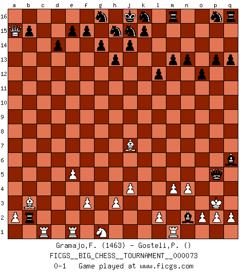 Last move : 0-1 2011 January 3 21:36:28 [Event "FICGS__BIG_CHESS__TOURNAMENT__000073"] [Site "FICGS"] [Date "2010.12.15"] [Round "1"] [White "Gramajo,Francisco"] [Black "Gosteli,Patrice"] [Result "0-1"] [WhiteElo "1463"] [BlackElo ""] 1.j2-k4 m15-m13 2.n2-n4 n15-n13 3.m2-m4 o15-o13 4.p1-o3 p15-p13 5.d2-d4 o13-o12 6.l1-o4 b16-c14 7.e2-e4 l15-l13 8.o1-d11 q15-q13 9.o4-c15 d15-d14 10.m1-m3 c16-k9 11.d11-b13 e16-c16 12.c15-a13 c14-a13 13.h1-q9 l16-o13 14.m3-l3 c16-c13 15.b13-g8 l13-l12 16.c1-j7 c13-c2 17.b1-d2 a16-c16 18.d2-c4 k9-e4 19.f2-f3 e4-d3 20.f1-d3 o13-d3 21.c4-e5 d3-n12 22.q9-f9 c2-g2 23.j1-h1 c16-c2 24.g8-b3 c2-b2 25.a1-c1 g15-g14 26.l3-l11 h14-h13 27.q1-m1 f16-l11 28.c1-c16 h16-f14 29.f9-e9 l11-j13 30.e9-a13 f14-g13 31.a13-a15 g13-g3 32.h1-j2 o16-d6 33.c16-c1 d6-e5 34.d4-e5 n12-g6 35.j3-j4 g2-h2 36.k1-h2 g3-h2 37.j2-k3 h2-k2 38.k3-l4 g6-h7 39.l4-m5 k2-k4 40.m5-n5 k4-n7 41.n5-o4 j13-q6 42.o4-p4 h7-k9 43.p4-p3 n7-p7 44.o3-p5 p7-p5 45.p3-o3 k9-p4 46.o3-p3 p4-n2 0-1 Follow this game move after move (download)There's never before been a Chess player with such a thorough knowledge of the intricacies of the game and such an absolutely indomitable will to win. I think Bobby is the greatest player that ever lived. (Lisa Lane) Besser ein falscher Plan, logisch durchgeführt, als gar kein Plan. (Viktor Kortschnoi) La única cosa que los jugadores de Ajedrez tienen en común, es el Ajedrez. (Lodewijk Prins) Si le désir cupide (et stupide) de gagner est une inépuisable source de souffrance, une combinaison brillante sur l'échiquier est une découverte : le coquelicot qui s'épanouit lorsque apparaît la Voie Lactée. (Arrabal) Luck is the residue of design. (John Milton)