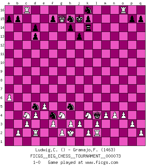 Last move : 1-0 2011 March 27 22:56:57 [Event "FICGS__BIG_CHESS__TOURNAMENT__000073"] [Site "FICGS"] [Date "2010.12.15"] [Round "1"] [White "Ludwig,Christian"] [Black "Gramajo,Francisco"] [Result "1-0"] [WhiteElo ""] [BlackElo "1463"] 1.n2-n4 j15-k13 2.o1-g8 n15-n14 3.o2-o3 e15-e13 4.e2-e4 o16-c5 5.h2-g4 d15-d13 6.g1-f3 p16-o14 7.d2-d4 c5-e7 8.j2-k4 f16-b12 9.k4-j6 m15-m13 10.h1-o7 c16-l8 11.o7-e7 h16-p9 12.p2-p3 n14-n13 13.f1-c4 l16-p12 14.e7-d6 b16-c14 15.f3-h4 b12-j5 16.g4-j5 e16-e14 17.m2-m4 e14-f14 18.f2-f3 m16-m14 19.c1-k8 a16-e16 20.l1-o4 m14-l14 21.l2-l3 e16-e14 22.g8-j10 e14-d14 23.k8-e13 c14-e13 24.o4-e13 l8-j6 25.e13-d14 c15-d14 26.h4-j6 p12-j6 27.d6-j6 q16-m16 28.p1-n2 o14-n12 29.n2-o4 m16-m14 30.j10-m13 n12-l11 31.m13-l14 m14-l14 32.c4-o15 l14-o14 33.o15-d5 o14-o9 34.j5-k7 o9-g9 35.e1-e2 f14-g14 36.j1-h2 p9-k9 37.m1-m2 l11-m9 38.d5-j10 k9-k10 39.c2-c3 m9-k8 40.j6-d11 k8-j10 41.k7-h6 g9-k9 42.o4-m3 k13-h12 43.b1-a3 j10-h8 44.m2-l2 h8-g6 45.k1-m2 g6-f4 46.e2-d2 k9-g9 47.h6-g4 k10-k8 48.a3-c4 g14-g11 49.d11-h7 h12-j10 50.m3-k4 j10-h8 51.a2-a4 h8-g6 52.m2-l4 g16-f14 53.a4-a5 f14-e12 54.a5-a6 e12-f10 55.a1-a5 f10-g8 56.a5-k5 k8-o8 57.o3-o4 g8-j7 58.k5-o5 o8-b8 59.e4-e5 f4-d5 60.o5-o15 d5-f4 61.q1-a1 f4-d5 62.a1-a5 g9-g7 63.h7-h12 g6-f4 64.a5-c5 g11-g12 65.c5-c16 j16-j15 66.h12-l15 g12-k12 67.l15-l13 k12-k14 68.l13-n13 b8-l8 69.n13-g7 j7-h5 70.g7-c11 l8-l4 71.c11-g15 j14-j13 72.o15-o16 1-0 Follow this game move after move (download)Is Bobby Fischer quite sane ? (Salo Flohr) Im Spitzenschach von heute geht es nur um Vorbereitung, um tiefgründige, sorgfältige Eröffnungsvorbereitung. (Nigel Short) El Ajedrez, como cualquier actividad creativa, solo puede existir a través del esfuerzo combinado de aquellos que tienen talento creativo y de aquellos que poseen la habilidad de organizar su trabajo creativo. (Mikhail Botvinnik) Karpov est une pièce de musée. (Garry Kasparov) Luck never made a man wise. (Seneca, Letters to Lucilius)