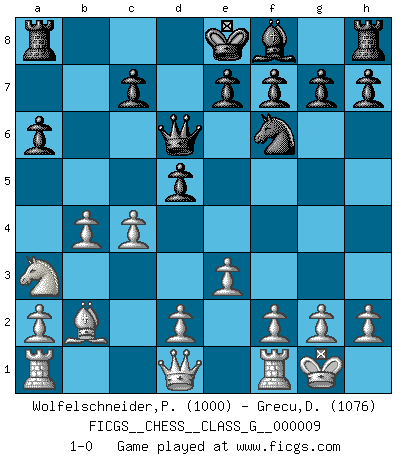 Last move : 1-0 2006 December 18 17:43:5 [Event "FICGS__CHESS__CLASS_G__000009"] [Site "FICGS"] [Date "2006.12.03"] [Round "1"] [White "Wolfelschneider,Peter"] [Black "Grecu,Daniel"] [Result "1-0"] [WhiteElo "1000"] [BlackElo "1076"] 1.b4 b5 2.Bb2 d5 3.e3 Nc6 4.Bxb5 Bd7 5.Nf3 a6 6.Bxc6 Bxc6 7.Ne5 Qd6 8.Nxc6 Qxc6 9.O-O Nf6 10.Na3 Qd6 11.c4 1-0 Polish (Sokolsky) opening Kingside Castling by player White (move 9) Player White won this chess game. Follow this game move after move (download)Spassky will not be psyched out by Fischer. (Mike Goodall) Darum geht es im Schach. Einen Tag gibst du deinem Gegner eine Lektion, am nächsten Tag gibt er dir eine. (Robert James Fischer) Con o sin el título, Bobby Fischer fue sin lugar a dudas el mas grande jugador de su época. (Burt Hochberg) Nous sommes les pions de la mystérieuse partie d'Echecs jouée par Dieu. Il nous déplace, nous arrête, nous pousse encore, puis nous lance un à un dans la boîte du Néant. Epitaphe sur la tombe de David Janowsky (1868-1927). In God we trust, all others we virus scan. (Anonymous)