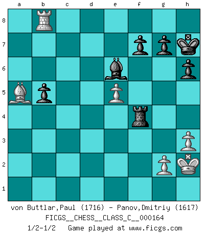 Last move : 1/2-1/2 2011 January 21 15:35:50 [Event "FICGS__CHESS__CLASS_C__000164"] [Site "FICGS"] [Date "2010.12.16"] [Round "1"] [White "von Buttlar,Paul"] [Black "Panov,Dmitriy"] [Result "1/2-1/2"] [WhiteElo "1716"] [BlackElo "1617"] 1.c4 Nf6 2.Nc3 e6 3.e4 d5 4.cxd5 exd5 5.e5 Ne4 6.d4 Bb4 7.Qa4+ Nc6 8.Bb5 O-O 9.Nge2 Nxd4 10.Nxd4 c5 11.Nde2 d4 12.a3 dxc3 13.O-O Nd2 14.axb4 Nxf1 15.Kxf1 a6 16.Nxc3 axb5 17.Qxa8 cxb4 18.Qa5 Qd3+ 19.Ke1 bxc3 20.Qxc3 Qe4+ 21.Kf1 Bf5 22.f3 Qh4 23.Kg1 Rc8 24.Qe3 Qb4 25.h3 h6 26.Ra3 Rd8 27.Kh2 Qc4 28.Qf4 Qc2 29.Rc3 Qb1 30.Rc7 Be6 31.Rxb7 Rc8 32.Bd2 Qxb2 33.Qe3 Ra8 34.Qe1 Qb3 35.Rb6 Qc4 36.Qg3 Kh8 37.Qe1 Ra2 38.Rd6 Qc2 39.Rd8+ Kh7 40.Qg3 Qg6 41.Qh4 Rb2 42.Qd4 Qc2 43.Qc3 Qxc3 44.Bxc3 Rb3 45.Ba5 Re3 46.f4 Re4 47.Rb8 Rxf4 1/2-1/2 English : Mikenas-Carls variation Kingside Castling by player Black (move 8) Kingside Castling by player White (move 13) This chess game ended in a draw. Follow this game move after move (download)Avoid the crowd. Do your own thinking independently. Be the Chess player, not the Chess piece. (Ralph Charell) Im Wettkampf zwischen starken Meistern kommen Fehler sehr selten vor, deshalb ist es mit bloßem Warten nicht getan. (José Raúl Capablanca) Un sacrificio se refuta mucho mejor al aceptarlo. (Wilhelm Steinitz) Demandez au pauvre Cg1 ce qu'il en pense. Eduard Gufeld à propos de la variante Saemisch de l'Est-Indienne. Horse racing is animated roulette. (Roger Kahn)