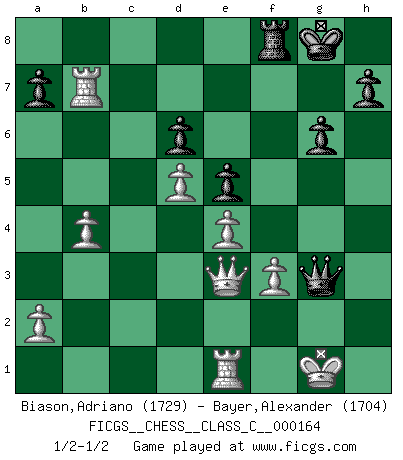 Last move : 1/2-1/2 2011 May 12 22:42:43 [Event "FICGS__CHESS__CLASS_C__000164"] [Site "FICGS"] [Date "2010.12.16"] [Round "1"] [White "Biason,Adriano"] [Black "Bayer,Alexander"] [Result "1/2-1/2"] [WhiteElo "1729"] [BlackElo "1704"] 1.d4 Nf6 2.c4 g6 3.Nc3 Bg7 4.e4 O-O 5.Nf3 d6 6.Be2 e5 7.O-O Nc6 8.d5 Ne7 9.b4 Nh5 10.Re1 f5 11.Ng5 Nf6 12.Bf3 fxe4 13.Ncxe4 Nf5 14.Nxf6+ Bxf6 15.Ne4 Nd4 16.Be3 Nxf3+ 17.Qxf3 Bh4 18.Qe2 Bf5 19.Ng3 Rf7 20.Nxf5 Rxf5 21.c5 Bg5 22.Rac1 Bxe3 23.fxe3 Qg5 24.cxd6 cxd6 25.e4 Rf4 26.Rc7 Raf8 27.Rxb7 Qf6 28.h3 Qh4 29.Qe3 Rf3 30.gxf3 Qg3+ 31.Kh1 Qxh3+ 32.Kg1 Qg3+ 1/2-1/2 King's Indian : 4.e4 Kingside Castling by player Black (move 4) Kingside Castling by player White (move 7) This chess game ended in a draw. Follow this game move after move (download)Nothing excites jaded Grandmasters more than a theoretical novelty. (Dominic Lawson) Der Vorposten provoziert a) eine Basis für neue Angriffe und b) eine Schwächung der gegnerischen Widerstandskraft in der fraglichen Linie. (Aaron Nimzowitsch) Sin errores no puede haber brillantez. (Emanuel Lasker) Les réformistes prétendent que les progrès de la théorie conduiront à la disparition des échecs, et qu'il faut, pour leur rendre vie, en remanier les règles. En réalité, qu'exprime cette affirmation? Le mépris de l'intuition, de l'imagination et de tous les autres éléments qui font des échecs un art. (Alexander Alekhine) There will be no order, only chaos. (Sol Robeson in Pi by Darren Aronofsky)