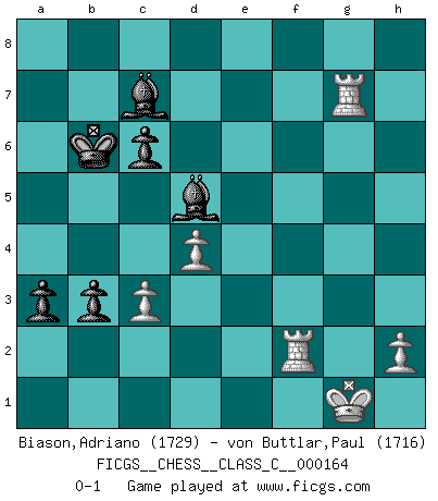 Last move : 0-1 2011 September 2 23:58:21 [Event "FICGS__CHESS__CLASS_C__000164"] [Site "FICGS"] [Date "2010.12.16"] [Round "1"] [White "Biason,Adriano"] [Black "von Buttlar,Paul"] [Result "0-1"] [WhiteElo "1729"] [BlackElo "1716"] 1.d4 d5 2.c4 c6 3.Nf3 Nf6 4.Nc3 e6 5.Bg5 h6 6.Bh4 dxc4 7.e4 g5 8.Bg3 b5 9.Be2 Bb7 10.O-O Nbd7 11.Ne5 h5 12.Nxd7 Qxd7 13.Be5 Rh6 14.Qc1 Rg6 15.Bxf6 Rxf6 16.Qxg5 Rg6 17.Qe3 b4 18.Na4 O-O-O 19.Rfd1 Be7 20.Bxh5 Rg7 21.Nc5 Qc7 22.Bxf7 Rxf7 23.Nxe6 Qd7 24.Nxd8 Bxd8 25.a3 b3 26.Rac1 Qe6 27.Qe2 Ba6 28.a4 Kb7 29.Qh5 Qf6 30.Qe2 Ba5 31.Qe3 c3 32.bxc3 Bc4 33.Rb1 Qd6 34.Rd2 Qa3 35.f4 Qxa4 36.g4 Bc7 37.f5 Qb5 38.g5 a5 39.g6 Rxf5 40.exf5 Qxf5 41.Re1 Qxg6+ 42.Rg2 Qh5 43.Qf2 Qh6 44.Rg4 a4 45.Qg2 Bd5 46.Qe2 Qh5 47.Rg7 Qxe2 48.Rxe2 Kb6 49.Rf2 a3 0-1 QGD Slav : 4.Nc3 Kingside Castling by player White (move 10) Queenside Castling by player Black (move 18) Player Black won this chess game. Follow this game move after move (download)The passion for playing Chess is one of the most unaccountable in the world. (H.G. Wells) Ein Gewinn durch eine ungenaue Kombination, sei sie auch noch so vorzeigbar, erfüllt mich mit Schaudern. (Wilhelm Steinitz) Evita las multitudes. Haz independientemente tu propio razonamiento. Trata de ser el jugador de Ajedrez, no la pieza de Ajedrez. (Ralph Charell) Les Echecs ont trois composantes : le temps, l'espace et le matériel en dernier. (Mikhail Tal) We cannot be sure of having something to live for unless we are willing to die for it. (Ernesto Che Guevara)