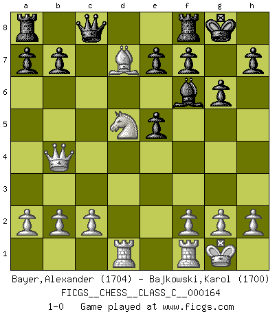 Last move : 1-0 2011 January 8 15:8:46 [Event "FICGS__CHESS__CLASS_C__000164"] [Site "FICGS"] [Date "2010.12.16"] [Round "1"] [White "Bayer,Alexander"] [Black "Bajkowski,Karol"] [Result "1-0"] [WhiteElo "1704"] [BlackElo "1700"] 1.e4 c5 2.Nf3 Nc6 3.d4 cxd4 4.Nxd4 Nxd4 5.Qxd4 d6 6.Be2 Bd7 7.O-O Nf6 8.Nc3 g6 9.Qb4 Qc7 10.Bg5 Bg7 11.Bxf6 Bxf6 12.Nd5 Qc6 13.Bb5 Qc8 14.Rad1 O-O 15.e5 dxe5 16.Bxd7 1-0 Sicilian defense Kingside Castling by player White (move 7) Kingside Castling by player Black (move 14) Player White won this chess game. Follow this game move after move (download)Kasparov : J'adoube , Ivanchuk : S'il vous plaît ! (Garry Kasparov & Vassily Ivanchuk, Linares 1997) Ich würde die 30 stärksten Spieler der USA im Simultanspiel besiegen. (José Raúl Capablanca) Existen dos clases de sacrificios: los correctos y los mÃos. (Mikhail Tal) Le temps de noter son nom sur la feuille de partie, j'étais déjà en zeitnot ! D'un modeste amateur apparié lors de la première ronde d'un open contre le grand-maître Azmaïparashvili. The question of whether computers can think is just like question of whether submarines can swim. (Edsger W. Dijkstra)