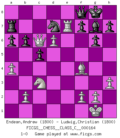 Last move : 1-0 2011 April 3 16:50:59 [Event "FICGS__CHESS__CLASS_C__000164"] [Site "FICGS"] [Date "2010.12.16"] [Round "1"] [White "Endean,Andrew"] [Black "Ludwig,Christian"] [Result "1-0"] [WhiteElo "1800"] [BlackElo "1800"] 1.d4 Nf6 2.c4 c5 3.d5 d6 4.Nc3 g6 5.e4 Bg7 6.Nf3 O-O 7.h3 e6 8.Bd3 exd5 9.cxd5 Re8 10.O-O Qc7 11.Re1 a6 12.a4 Nbd7 13.Bc4 Rb8 14.Bf4 Nh5 15.Bh2 Ne5 16.Be2 Nxf3+ 17.Bxf3 Nf6 18.e5 dxe5 19.d6 Qd8 20.Bxe5 Nd7 21.Bf4 b6 22.Rxe8+ Qxe8 23.Qd2 Bb7 24.Re1 Qd8 25.Bxb7 Rxb7 26.Qd5 Ra7 27.Re7 Qf8 28.Qc6 1-0 Benoni defense, Hromodka system Kingside Castling by player Black (move 6) Kingside Castling by player White (move 10) Player White won this chess game. Follow this game move after move (download)It is no time to be playing Chess when the house is on fire. (Italian Proverb) Taktik ist was man tun muß, wenn etwas zu tun ist. Strategie ist was man tun muß, wenn nichts zu tun ist. (Savielly Grigorievitsch Tartakower) ¿Cual es el objetivo de jugar una apertura de gambito?... Para adquirir una reputación de ser un jugador apuesto a costo de perder el juego. (Siegbert Tarrasch) Ce n'est pas pour s'amuser qu'il joue aux échecs : il célèbre un culte. (Vladimir Nabokov) The greatest con, that he ever pulled... was making you believe... that he is you. (Revolver, movie)