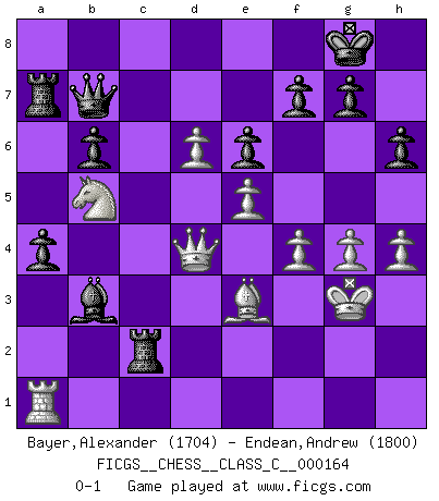 Last move : 0-1 2011 August 27 10:2:20 [Event "FICGS__CHESS__CLASS_C__000164"] [Site "FICGS"] [Date "2010.12.16"] [Round "1"] [White "Bayer,Alexander"] [Black "Endean,Andrew"] [Result "0-1"] [WhiteElo "1704"] [BlackElo "1800"] 1.d4 Nf6 2.c4 e6 3.Nf3 b6 4.g3 Ba6 5.b3 Bb4+ 6.Bd2 Be7 7.Bg2 c6 8.O-O d5 9.Qc2 Nbd7 10.Bg5 O-O 11.Rd1 Rc8 12.Nc3 h6 13.Bf4 Nh5 14.Bd2 Nhf6 15.e4 dxc4 16.h3 Re8 17.Be3 Bb4 18.Na4 cxb3 19.axb3 Bb5 20.Ne5 Nxe5 21.dxe5 Nd7 22.Nc3 Rc7 23.f4 Qc8 24.Bf3 Rd8 25.Rd6 a5 26.Rad1 Bxd6 27.exd6 Rb7 28.e5 Ba6 29.Kh2 c5 30.g4 Ra7 31.Be4 Rf8 32.h4 c4 33.Kg3 Nc5 34.bxc4 Bxc4 35.Qb1 Nxe4+ 36.Qxe4 Bb3 37.Rc1 Qb7 38.Qd4 a4 39.Ra1 Rc8 40.Nb5 Rc2 0-1 This chess game has been lost on time (started : 2010.12.16 9:17:2) Queen's Indian : Nimzovich variation (exaggerated Fianchetto) Kingside Castling by player White (move 8) Kingside Castling by player Black (move 10) Player Black won this chess game. Follow this game move after move (download)Without error there can be no brilliancy. (Emanuel Lasker) Ohne Fehler kann es keine Brillanz geben. (Emanuel Lasker) Bobby es el jugador de Ajedrez mas fino que este país jamás haya producido. Su memoria para las movidas, su brillantez en soñar combinaciones y su feróz determinación por la victoria son algo extraño. (John Collins) Si le désir cupide (et stupide) de gagner est une inépuisable source de souffrance, une combinaison brillante sur l'échiquier est une découverte : le coquelicot qui s'épanouit lorsque apparaît la Voie Lactée. (Arrabal) Always be a first-rate version of yourself, instead of a second-rate version of somebody else. (Judy Garland)