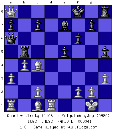 Last move : 1-0 2011 January 4 4:2:28 [Event "FICGS__CHESS__RAPID_E__000041"] [Site "FICGS"] [Date "2010.12.16"] [Round "1"] [White "Quanter,Kirsty"] [Black "Melquiades,Jay"] [Result "1-0"] [WhiteElo "1106"] [BlackElo "0980"] 1.e4 e5 2.Nf3 d6 3.d4 Nc6 4.d5 Bg4 5.dxc6 bxc6 6.h3 Bxf3 7.Qxf3 Nf6 8.Nc3 d5 9.exd5 Nxd5 10.a3 Be7 11.Nxd5 cxd5 12.Bb5+ Kf8 13.Bc6 Rb8 14.Bxd5 f6 15.O-O h5 16.Rd1 Qd6 17.b4 Rb5 18.Bc4 Qa6 19.Qa8+ 1-0 Philidor's defense Kingside Castling by player White (move 15) Player White won this chess game. Follow this game move after move (download)The chessboard is the world, the pieces are the phenomena of the Universe, the rules of the game are what we call the laws of Nature and the player on the other side is hidden from us. (Thomas Huxley) Der Umstand, daß uns eine 7 Stunden Zeitkontrolle ermöglicht eine großartige, tiefe Partie zu spielen, ist für die Massenmedien nicht weiter von Bedeutung. (Alexej Shirov) La captura del Rey enemigo es la finalidad pero no el primer objetivo de la partida. (William Steinitz) Le jeu d'échecs est comme rejeté hors du temps. (Antoine de Saint-Exupéry) If you lose the game you should win the analysis! (Proverb)