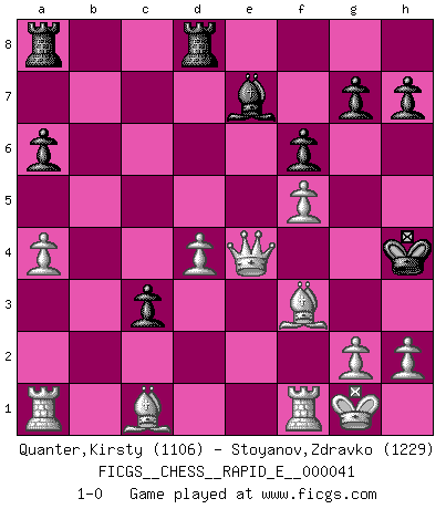Last move : 1-0 2010 December 23 20:33:8 [Event "FICGS__CHESS__RAPID_E__000041"] [Site "FICGS"] [Date "2010.12.16"] [Round "1"] [White "Quanter,Kirsty"] [Black "Stoyanov,Zdravko"] [Result "1-0"] [WhiteElo "1106"] [BlackElo "1229"] 1.e4 c5 2.f4 a6 3.Nf3 Nc6 4.Nc3 e6 5.Be2 Be7 6.O-O Nf6 7.e5 Nd5 8.Nxd5 exd5 9.d4 c4 10.c3 d6 11.b3 b5 12.a4 b4 13.bxc4 bxc3 14.cxd5 Nb4 15.Qb3 dxe5 16.Nxe5 Nxd5 17.Bc4 Bb7 18.Qxb7 f6 19.Qc6+ Kf8 20.Nd7+ Ke8 21.Nc5 Kf8 22.Ne6+ Kf7 23.Nxd8+ Rhxd8 24.Bxd5+ Kg6 25.f5+ Kh5 26.Bf3+ Kh4 27.Qe4+ 1-0 Sicilian : Grand Prix attack Kingside Castling by player White (move 6) Player White won this chess game. Follow this game move after move (download)He who fears an isolated Queen's Pawn should give up Chess. (Siegbert Tarrasch) Nach Morphy wurde nichts neues mehr in der Behandlung offener Positionen gefunden. (Mikhail Moiseyevich Botvinik) El Ajedrez es un expediente tonto que hace creer a la gente inactiva que hacen una cosa muy astuta cuando solamente estan perdiendo su tiempo. (George Bernard Shaw) Que feriez-vous si vous étiez en train de jouer aux échecs et que la fin du monde arrive ? Je continuerais à jouer. (Saint Borromée) Children in the dark cause accidents, accidents in the dark cause children. (Unknown)