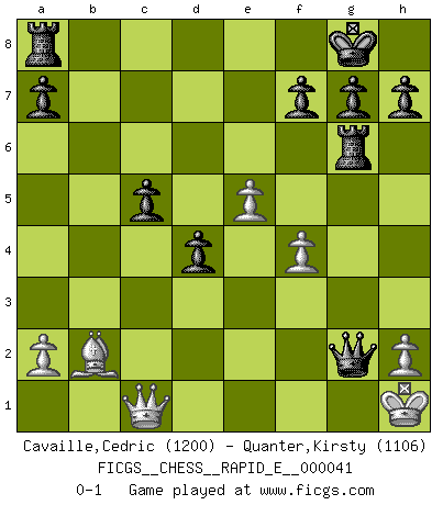 Last move : 0-1 2011 January 21 20:18:56 [Event "FICGS__CHESS__RAPID_E__000041"] [Site "FICGS"] [Date "2010.12.16"] [Round "1"] [White "Cavaille,Cedric"] [Black "Quanter,Kirsty"] [Result "0-1"] [WhiteElo "1200"] [BlackElo "1106"] 1.e4 c5 2.Nf3 Nc6 3.Bc4 e5 4.d4 cxd4 5.c3 Nf6 6.cxd4 Nxe4 7.dxe5 Bb4+ 8.Nc3 Nxc3 9.bxc3 Bxc3+ 10.Bd2 Bxa1 11.Qxa1 O-O 12.O-O d5 13.Bb5 Bg4 14.Bxc6 bxc6 15.Qc1 Bxf3 16.gxf3 Re8 17.f4 Re6 18.Bc3 d4 19.Bb2 Rg6+ 20.Kh1 Qd5+ 21.f3 c5 22.Rg1 Qxf3+ 23.Rg2 Qxg2+ 0-1 Sicilian defense Kingside Castling by player Black (move 11) Kingside Castling by player White (move 12) Player Black won this chess game. Follow this game move after move (download)Chess is mental torture. (Garry Kasparov) Wir können eben der zündenden Macht des Opfers nicht wiederstehen, denn die Begeisterung für das Opfer liegt in der Natur des Menschen. (Rudolf Spielmann) A la fecha, Fischer esta simplemente un nivel arriba de todos los mejores jugadores de Ajedrez del mundo. (John Jacobs) Aux échecs, les retours au sommet sont rares : les dommages psychologiques consécutifs à une défaite sont trop sévères. (Daily Telegraph) It is not enough to be a good player... you must also play well. (Siegbert Tarrasch)
