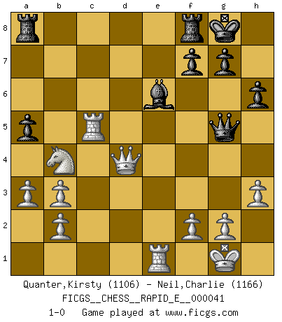 Last move : 1-0 2011 January 2 16:11:6 [Event "FICGS__CHESS__RAPID_E__000041"] [Site "FICGS"] [Date "2010.12.16"] [Round "1"] [White "Quanter,Kirsty"] [Black "Neil,Charlie"] [Result "1-0"] [WhiteElo "1106"] [BlackElo "1166"] 1.e4 e5 2.Nf3 d6 3.d4 Nd7 4.Nc3 Ngf6 5.Bb5 c6 6.Ba4 b5 7.Bb3 Be7 8.a3 O-O 9.O-O a5 10.h3 Qc7 11.Bg5 exd4 12.Nxd4 h6 13.Bf4 Nc5 14.Re1 Nxb3 15.cxb3 Qb6 16.e5 dxe5 17.Bxe5 Bc5 18.Qd2 Bxd4 19.Bxd4 c5 20.Bxf6 Qxf6 21.Nd5 Qd8 22.Rac1 Be6 23.Rxc5 b4 24.Qd4 Qg5 25.Nxb4 1-0 Philidor : Hanham variation Kingside Castling by player Black (move 8) Kingside Castling by player White (move 9) Player White won this chess game. Follow this game move after move (download)In the perfect Chess combination as in a first-rate short story, the whole plot and counter-plot should lead up to a striking finale, the interest not being allayed until the very last moment. (Yates and Winter) Es ist nicht das erste mal, dass sich die FIDE dem Arabischen Geld gebeugt hat (über die FIDE WM 2004 in Lybien). (Larry Evans) Por esta medida (el intervalo entre Fischer y sus contemporaneos), yo le considero el mas grande campeón mundial. (Garry Kasparov) Il a essayé de se convaincre qu'il pourrait empêcher toutes les erreurs et ne jamais perdre. L'horreur ! Gary Kasparov au sujet de Robert Fischer. Tomorrow's what you make of it. (Horatio Caine, C.S.I. Miami)