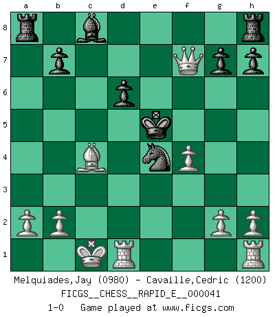 Last move : 1-0 2011 January 8 21:28:5 [Event "FICGS__CHESS__RAPID_E__000041"] [Site "FICGS"] [Date "2010.12.16"] [Round "1"] [White "Melquiades,Jay"] [Black "Cavaille,Cedric"] [Result "1-0"] [WhiteElo "0980"] [BlackElo "1200"] 1.e4 c5 2.Nf3 d6 3.c4 Nf6 4.Nc3 Nbd7 5.d4 cxd4 6.Nxd4 e5 7.Bg5 exd4 8.Nd5 Be7 9.Qxd4 Ne5 10.O-O-O Qb6 11.Nxb6 axb6 12.Qxb6 Nxc4 13.Bxc4 Nxe4 14.Bxe7 Kxe7 15.Qc7+ Kf6 16.Qxf7+ Ke5 17.f4+ 1-0 Sicilian Queenside Castling by player White (move 10) Player White won this chess game. Follow this game move after move (download)Bobby Fischer is the greatest Chess player who has ever lived. (Ken Smith) Im Internet Chess Club betrug mein Rating vorübergehend 3350 ELO-Punkte. (Sergej Karjakin) El pensamiento metódico es mas útil en el Ajedrez que la inspiración. (C. J. S. Purdy) Lorsque vous vous retrouvez devant une position atroce, ne tendez pas un ultime piège dérisoire avec l'intention d'abandonner si l'adversaire le déjoue ! Faites-vous plutôt un devoir de résister comme si votre vie en dépendait. Jouez le coup qui vous déplairait au centuple si vous étiez dans la peau de votre tortionnaire ! We cannot be sure of having something to live for unless we are willing to die for it. (Ernesto Che Guevara)