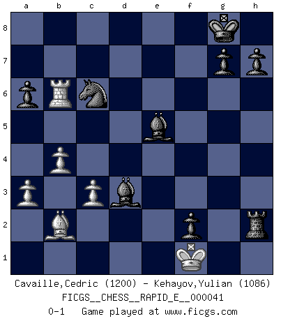 Last move : 0-1 2011 February 3 23:40:21 [Event "FICGS__CHESS__RAPID_E__000041"] [Site "FICGS"] [Date "2010.12.16"] [Round "1"] [White "Cavaille,Cedric"] [Black "Kehayov,Yulian"] [Result "0-1"] [WhiteElo "1200"] [BlackElo "1086"] 1.e4 e5 2.Nf3 Nc6 3.Bc4 Nf6 4.Nc3 Be7 5.Ng5 O-O 6.Nxf7 Rxf7 7.Bxf7+ Kxf7 8.O-O d5 9.exd5 Nxd5 10.Nxd5 Qxd5 11.Re1 Kg8 12.c3 Be6 13.b4 Rf8 14.d3 Bf5 15.Qf3 Qxf3 16.gxf3 Bxd3 17.Rd1 Bg6 18.Rd7 Bd6 19.a3 a6 20.Rxc7 Bxc7 21.Bb2 Rxf3 22.Rd1 e4 23.Re1 Rh3 24.Kg2 Rxh2+ 25.Kg1 Ne7 26.Rd1 Nc6 27.Rd7 Be5 28.Rxb7 e3 29.Rb6 exf2+ 30.Kf1 Bd3+ 0-1 Two knights defense Kingside Castling by player Black (move 5) Kingside Castling by player White (move 8) Player Black won this chess game. Follow this game move after move (download)All my games are real. (Bobby Fischer) Ein Springer auf f6 gegen die eigene Rochadestellung ist schlimmer als ein rostiger Nagel im Knie. (Efim Bogoljubov) El Ajedrez es de 30 a 40 por ciento psicología. Uno no cuenta con esto cuando se juega contra una computadora. No lo puedo confundir. (Judith Polgar) Les échecs, c'est l'imagination. (David Bronstein) Internal peace cannot coexist with external war. (Don Groves)