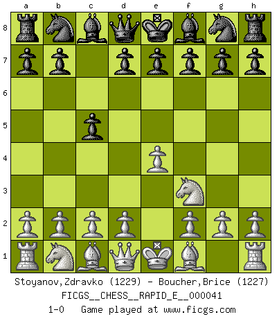 Last move : 1-0 2011 January 19 11:16:55 [Event "FICGS__CHESS__RAPID_E__000041"] [Site "FICGS"] [Date "2010.12.16"] [Round "1"] [White "Stoyanov,Zdravko"] [Black "Boucher,Brice"] [Result "1-0"] [WhiteElo "1229"] [BlackElo "1227"] 1.e4 c5 2.Nf3 1-0 This chess game has been lost on time (started : 2010.12.16 23:21:6) Sicilian defense Player White won this chess game. Follow this game move after move (download)Openings teach you openings. Endgames teach you chess ! (Stephan Gerzadowicz) Der Knackpunkt bei der Konzentration ist, daß wir nur durch sie etwas Neues und Ungewöhnliches am Schachbrett finden können. Sie ist der einzige Weg durch neue neue Ideen eine Überraschung zu bereiten. (Garry Kasparov) El Ajedrez te enseña a controlarl la excitación inicial que sientes cuando vez algo que parece bueno y te enseña a pensar objetivamente cuando te encuentras en problemas. (Stanley Kubrick) Shah mat. Le roi est mort. Cri de fierté d'un joueur venant de terrasser son adversaire, courtoisement, sans effusion de sang. The worth of a book is to be measured by what you can carry away from it. (James Bryce)
