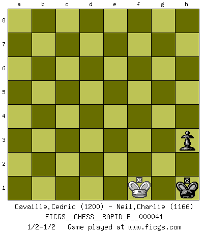 Last move : 1/2-1/2 2011 February 26 10:5:34 [Event "FICGS__CHESS__RAPID_E__000041"] [Site "FICGS"] [Date "2010.12.16"] [Round "1"] [White "Cavaille,Cedric"] [Black "Neil,Charlie"] [Result "1/2-1/2"] [WhiteElo "1200"] [BlackElo "1166"] 1.e4 e6 2.Nf3 d5 3.Nc3 c5 4.exd5 exd5 5.d4 cxd4 6.Qxd4 Nf6 7.Bf4 Be7 8.Bd3 O-O 9.O-O Nc6 10.Qe3 Be6 11.Ng5 d4 12.Nxe6 fxe6 13.Qxe6+ Kh8 14.Ne4 Nxe4 15.Bxe4 Bf6 16.Bxc6 bxc6 17.Qxc6 Rc8 18.Qd6 Rxc2 19.Qxd8 Rxd8 20.b3 d3 21.Rac1 Rxc1 22.Rxc1 g5 23.Bd2 Re8 24.g3 Re2 25.Rd1 Kg8 26.Bc1 Rxa2 27.Be3 a5 28.Rxd3 Ra3 29.f4 gxf4 30.gxf4 Kg7 31.Bc5 Ra1+ 32.Kg2 Ra2+ 33.Kg3 Rb2 34.h4 Kg6 35.Kg4 Re2 36.b4 axb4 37.Bxb4 Re4 38.Bc3 Bxc3 39.Rxc3 Re1 40.f5+ Kf6 41.Rc6+ Kf7 42.f6 Rf1 43.Kg5 Rg1+ 44.Kf5 Rf1+ 45.Kg4 Rxf6 46.Rxf6+ Kxf6 47.Kf4 Kg6 48.Kg4 Kh6 49.h5 Kg7 50.Kg5 h6+ 51.Kf4 Kf6 52.Kg4 Ke5 53.Kg3 Kf5 54.Kf3 Kg5 55.Kg3 Kxh5 56.Kf4 Kh4 57.Kf5 h5 58.Kf4 Kh3 59.Kf3 Kh2 60.Kf2 h4 61.Kf1 Kh1 62.Kf2 Kh2 63.Kf1 h3 64.Kf2 Kh1 65.Kf1 1/2-1/2 French defense Kingside Castling by player Black (move 8) Kingside Castling by player White (move 9) 10 pieces endgame at move 36 : White KRBPP , Black KRBPP WHITE : King + 1 Rook 1 Bishop 2 Pawns BLACK : King + 1 Rook 1 Bishop 2 Pawns 9 pieces endgame at move 37 : White KRBPP , Black KRBP WHITE : King + 1 Rook 1 Bishop 2 Pawns BLACK : King + 1 Rook 1 Bishop 1 Pawn 8 pieces endgame at move 38 : White KRPP , Black KRBP WHITE : King + 1 Rook 2 Pawns BLACK : King + 1 Rook 1 Bishop 1 Pawn 7 pieces endgame at move 39 : White KRPP , Black KRP WHITE : King + 1 Rook 2 Pawns BLACK : King + 1 Rook 1 Pawn 6 pieces endgame at move 45 : White KRP , Black KRP WHITE : King + 1 Rook 1 Pawn BLACK : King + 1 Rook 1 Pawn 5 pieces endgame at move 46 : White KRP , Black KP WHITE : King + 1 Rook 1 Pawn BLACK : King + 1 Pawn 4 pieces endgame at move 46 : White KP , Black KP WHITE : King + 1 Pawn BLACK : King + 1 Pawn 3 pieces endgame at move 55 : White K , Black KP WHITE : King + BLACK : King + 1 Pawn This chess game ended in a draw. Follow this game move after move (download)I'd rather have a Pawn than a finger. (Reuben Fine) Das Schach ist nichts für kleine Geister, es beansprucht einen vollen Mann, der sich nicht sklavisch an das Überlieferte hält, sondern selbständig die Tiefen des Spiels zu ergründen sucht. (Wilhelm Steinitz) Realmente no sabemos como el juego fue inventado, aunque hay sospechas. Tan pronto como descubramos a los culpables, se los haremos saber. (Bruce Pandolfini) Avec des compensations pour le matériel en plus... (Anonyme) Life doesn't imitate art, it imitates bad television. (Woody Allen)