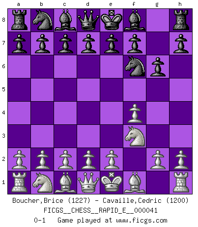 Last move : 0-1 2011 January 27 23:35:0 [Event "FICGS__CHESS__RAPID_E__000041"] [Site "FICGS"] [Date "2010.12.16"] [Round "1"] [White "Boucher,Brice"] [Black "Cavaille,Cedric"] [Result "0-1"] [WhiteElo "1227"] [BlackElo "1200"] 1.f4 Nf6 2.Nf3 g6 0-1 This chess game has been lost on time (started : 2010.12.16 23:21:6) Bird's Opening Player Black won this chess game. Follow this game move after move (download)When I asked Fischer why he had not played a certain move in our game, he replied: 'Well, you laughed when I wrote it down !' (Mikhail Tal) Ich rechne überhaupt nicht voraus. Ich gewinne auch so. (Robert James Fischer) El Ajedrez es un terrible juego. Si no controlas el centro, tu oponente tiene una posición mas holgada. Si tienes control del centro, ¡entonces realmente tu tienes algo de que preocuparte!. (Siegbert Tarrasch) Aucun coup ne doit être joué sans but. (Pedro Damiano) There are three kinds of lies: lies, damned lies and statistics. (Mark Twain)