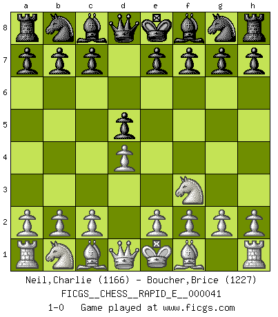 Last move : 1-0 2011 January 19 11:16:55 [Event "FICGS__CHESS__RAPID_E__000041"] [Site "FICGS"] [Date "2010.12.16"] [Round "1"] [White "Neil,Charlie"] [Black "Boucher,Brice"] [Result "1-0"] [WhiteElo "1166"] [BlackElo "1227"] 1.d4 d5 2.Nf3 1-0 This chess game has been lost on time (started : 2010.12.16 23:21:6) Queen's pawn game Player White won this chess game. Follow this game move after move (download)The older I grow, the more I value Pawns. (Keres) Die jungen Leute sollen verstehen, dass sie noch etwas von mir lernen können und müssen. (Viktor Kortschnoi) Mis oponentes también hacen buenas movidas. A veces yo no tomo esas cosas en consideración. (Bobby Fischer) Vous n'êtes pas toujours obligé de jouer le meilleur coup. Un coup doit être actif, entreprenant, correct et beau ! (David Bronstein) The right perception of any matter and a misunderstanding of the same matter do not wholly exclude each other. (Kafka's the trial)