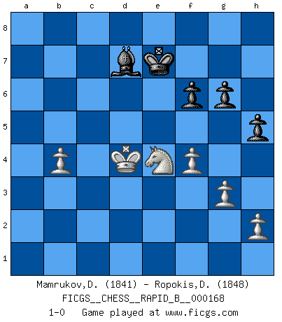 Last move : 1-0 2011 January 11 10:6:20 [Event "FICGS__CHESS__RAPID_B__000168"] [Site "FICGS"] [Date "2010.12.17"] [Round "1"] [White "Mamrukov,Dmitri"] [Black "Ropokis,Dimitrios"] [Result "1-0"] [WhiteElo "1841"] [BlackElo "1848"] 1.d4 Nf6 2.c4 e5 3.dxe5 Ng4 4.Nf3 Bc5 5.e3 Nc6 6.Nc3 Ngxe5 7.Nxe5 Nxe5 8.Be2 O-O 9.O-O Re8 10.b3 a5 11.Na4 Bf8 12.f4 Ng6 13.g3 c6 14.Bf3 d5 15.cxd5 Bh3 16.Re1 cxd5 17.Qd3 Rc8 18.Bb2 Ne7 19.Rad1 Nf5 20.Bxd5 Bb4 21.Bc3 Bxc3 22.Nxc3 Qb6 23.Qb5 Qxb5 24.Nxb5 Rxe3 25.Bxb7 Rxe1+ 26.Rxe1 Rb8 27.Bc6 g6 28.Re8+ Rxe8 29.Bxe8 f6 30.Kf2 Kf8 31.Bd7 Ke7 32.Bxf5 Bxf5 33.Ke3 Kd7 34.Nc3 Ke6 35.Ne4 h5 36.a3 Ke7 37.b4 axb4 38.axb4 Bd7 39.Kd4 1-0 Budapest : Adler variation Kingside Castling by player Black (move 8) Kingside Castling by player White (move 9) Player White won this chess game. Follow this game move after move (download)Chess is a fairy tale of 1001 blunders. (Savielly Tartakower) Schach ist Leben. (Robert James Fischer) La pasion por jugar al Ajedrez es una de las mas inexplicables en el mundo. (H.G. Wells) La conception d'un plan est le processus par lequel un joueur exploite les avantages de sa position tout en s'efforçant d'en réduire au minimum les inconvénients. Afin de garantir le succès, un plan doit toujours se fonder sur un diagnostic objectif des particularités d'une position. La conception d'un plan est d'autant plus difficile que la position est équilibrée, et grandement facilitée lorsqu'il n'existe qu'un seul plan susceptible de répondre aux exigences de la position. (Harry Golombek) If only faces could talk... (Pat Summerall, Sportscaster during the Super Bowl)