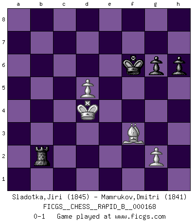Last move : 0-1 2011 February 17 14:17:24 [Event "FICGS__CHESS__RAPID_B__000168"] [Site "FICGS"] [Date "2010.12.17"] [Round "1"] [White "Sladotka,Jiri"] [Black "Mamrukov,Dmitri"] [Result "0-1"] [WhiteElo "1845"] [BlackElo "1841"] 1.e4 c6 2.d4 d5 3.exd5 cxd5 4.c3 Nc6 5.Nf3 Bf5 6.Qb3 Qd7 7.Ne5 Nxe5 8.dxe5 a6 9.Na3 e6 10.Nb5 Rc8 11.Be3 f6 12.f4 axb5 13.Bxb5 Rc6 14.a4 Ne7 15.a5 Kf7 16.O-O Be4 17.a6 bxa6 18.Rxa6 Qc8 19.Ra7 Rc7 20.Rfa1 Rxa7 21.Rxa7 h6 22.Bd4 fxe5 23.fxe5 Kg8 24.Bd7 Qd8 25.Bxe6+ Kh7 26.Rd7 Qe8 27.Qd1 Ng6 28.Qg4 Be7 29.Rxd5 Bxd5 30.Bxd5 Qc8 31.e6 Bc5 32.Be4 Bxd4+ 33.Kh1 Qe8 34.cxd4 Rf8 35.h4 Rf6 36.h5 Kh8 37.hxg6 Rxe6 38.Bf3 Qxg6 39.Qxg6 Rxg6 40.Kg1 Rb6 41.Kf2 g6 42.Ke3 Kg7 43.d5 Rxb2 44.Kd4 Kf6 0-1 Caro-Kann : Exchange variation Kingside Castling by player White (move 16) 10 pieces endgame at move 39 : White KQBPPP , Black KRPP WHITE : King + 1 Queen 1 Bishop 3 Pawns BLACK : King + 1 Rook 2 Pawns 9 pieces endgame at move 39 : White KBPPP , Black KRPP WHITE : King + 1 Bishop 3 Pawns BLACK : King + 1 Rook 2 Pawns 8 pieces endgame at move 43 : White KBPP , Black KRPP WHITE : King + 1 Bishop 2 Pawns BLACK : King + 1 Rook 2 Pawns Player Black won this chess game. Follow this game move after move (download)Not only will I predict his triumph over Botvinnik, but I'll go further and say that he'll probably be the greatest Chess player that ever lived. (John Collins) Der beste Spieler in einem Turnier gewinnt es nie. Er landet auf Platz zwei oder drei. (Siegbert Tarrasch) Si yo gano un torneo, yo lo gano por mí mismo. Yo hago las jugadas. Nadie me ayuda. (Bobby Fischer) Vous m'avez demandé de vous exposer quel est le fondement de la prière. Je ne fais que préparer les pièces du jeu sur la table... Nous sera-t-il permis d'en adopter les règles et si nous les appliquons scrupuleusement nous ne tarderons pas à faire mat le Roi divin ! Il ne pourra échapper à nos mains. (Sainte Thérèse d'Avila, Chemin de perfection) I would love to change the world, but they won't give me the source code. (Unknown)