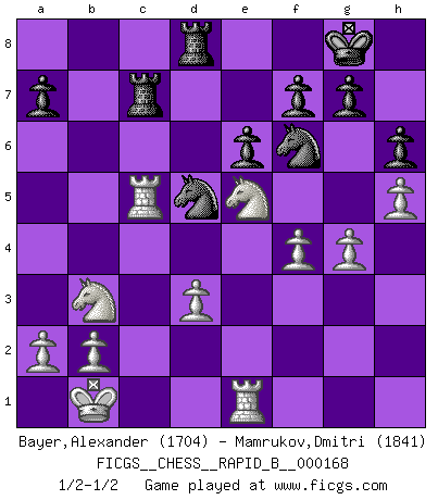 Last move : 1/2-1/2 2011 March 2 4:50:33 [Event "FICGS__CHESS__RAPID_B__000168"] [Site "FICGS"] [Date "2010.12.17"] [Round "1"] [White "Bayer,Alexander"] [Black "Mamrukov,Dmitri"] [Result "1/2-1/2"] [WhiteElo "1704"] [BlackElo "1841"] 1.e4 c6 2.d4 d5 3.Nc3 dxe4 4.Nxe4 Bf5 5.Ng3 Bg6 6.h4 h6 7.Nf3 Nd7 8.h5 Bh7 9.Bd3 Bxd3 10.Qxd3 e6 11.Bf4 Qa5+ 12.Bd2 Bb4 13.Ne4 Ngf6 14.Nd6+ Ke7 15.Nxb7 Bxd2+ 16.Nxd2 Qb4 17.Qb3 Qxd4 18.O-O-O Rab8 19.Qa3+ c5 20.Na5 Rhc8 21.Ndc4 Qf4+ 22.Kb1 Nd5 23.Rhe1 Kf8 24.g3 Qg4 25.Rh1 N7b6 26.Ne5 Qf5 27.f4 Kg8 28.Qd3 Qxd3 29.cxd3 Rc7 30.Rc1 Ne7 31.Rhe1 Nbd5 32.Nb3 Rbc8 33.Nd2 Nf6 34.g4 Rd8 35.Nb3 Ned5 36.Rxc5 1/2-1/2 Caro-Kann : Classical, 7...Nd7 Queenside Castling by player White (move 18) This chess game ended in a draw. Follow this game move after move (download)Some part of a mistake is always correct. (Savielly Tartakover) Schach ist Krieg, im Schach geht es um testosterongesteuerte Urschreie. (Garry Kasparov) Yo he agregado estos principios a la ley: pongan los Caballos en acción antes de que los dos Alfiles sean desarrollados. (Emanuel Lasker) RxDa4 pat (...) Every vice is only an exaggeration of a necessary and virtuous function. (Ralph Waldo Emerson, Journals 1936)